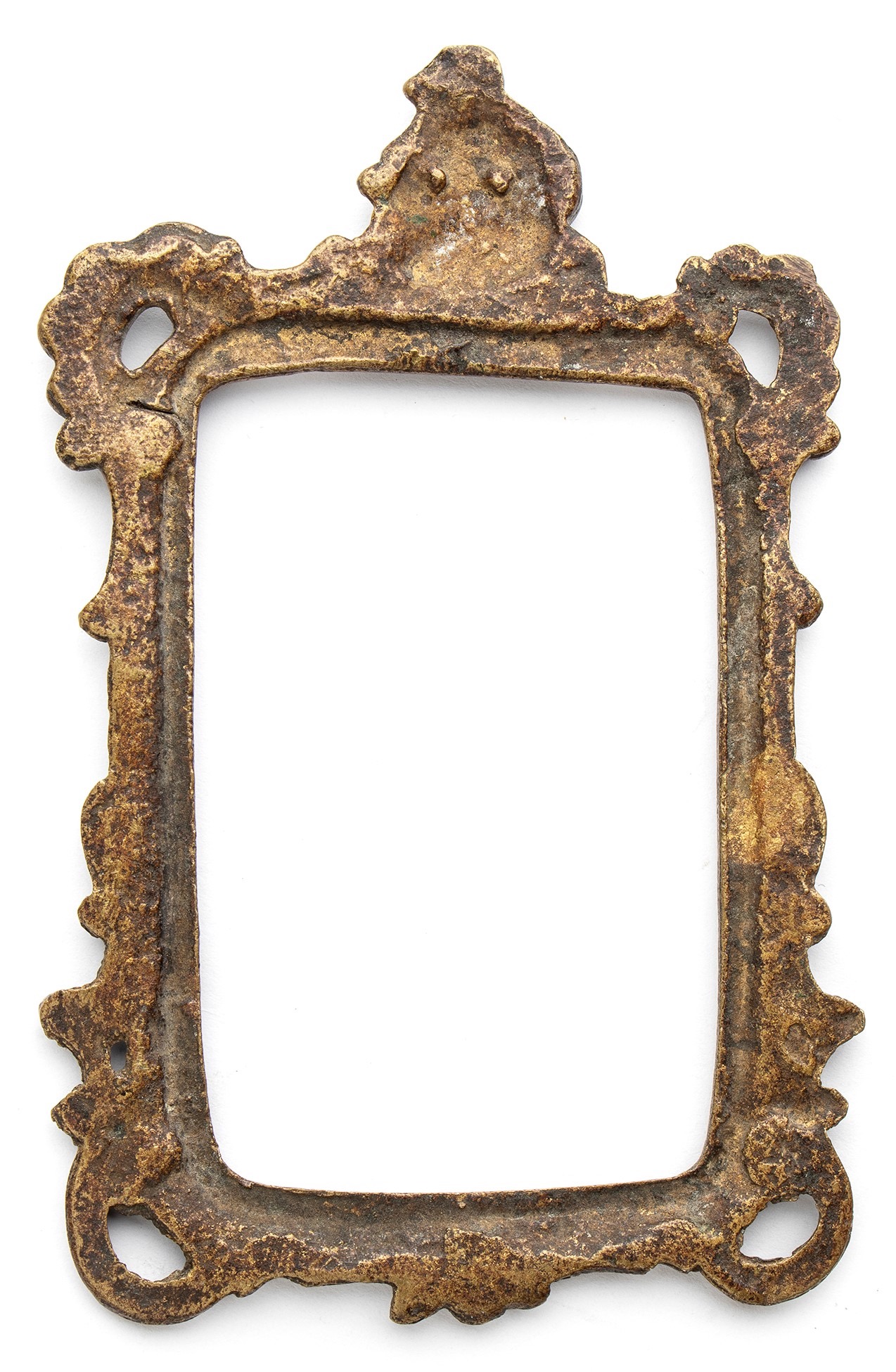 Piccola cornice figurata con due figure sulla cimasa. Fusione antica.