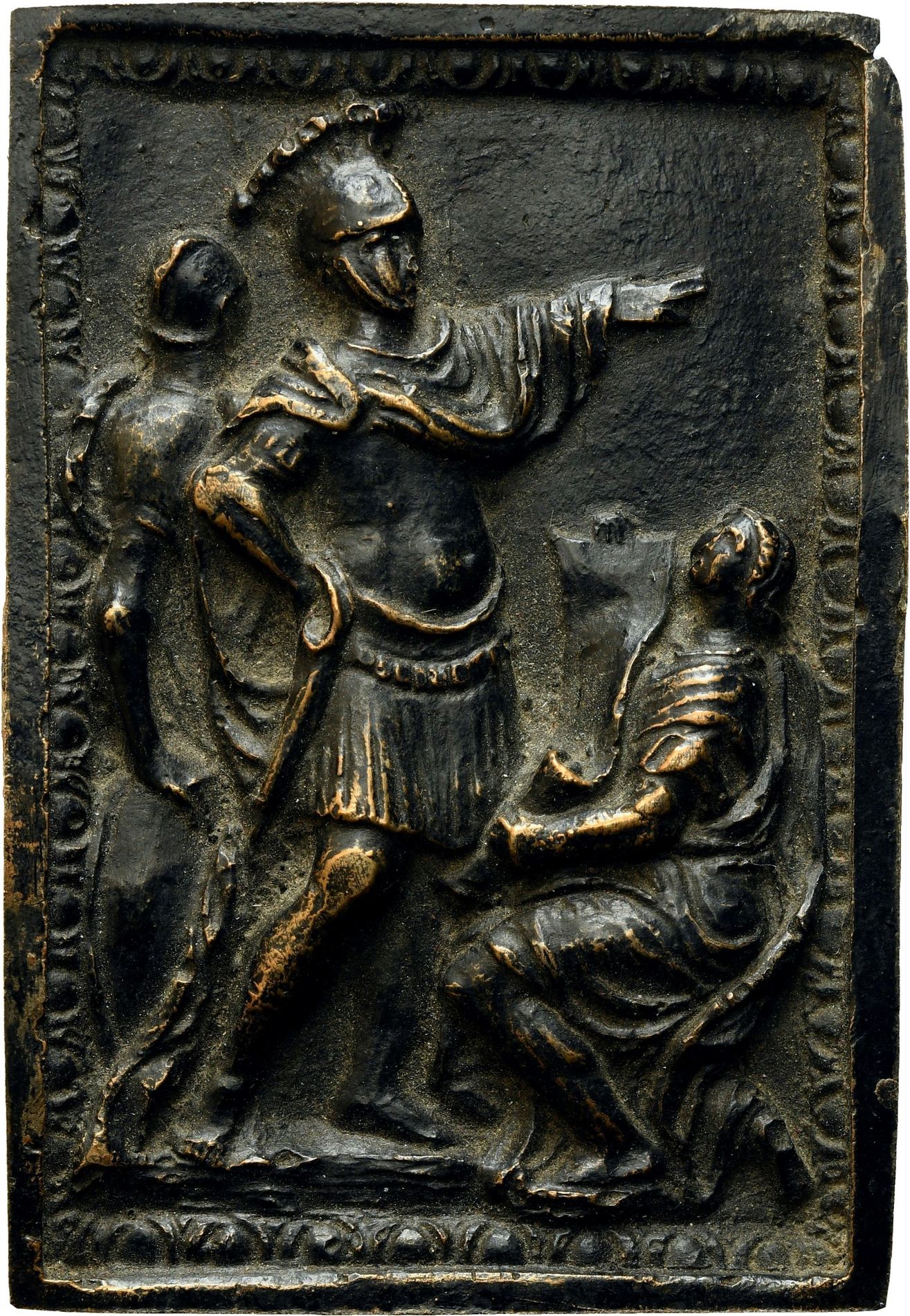 Figura femminile in primo piano, un’altra figura chinata ( fiume TEVERE ?) dietro di loro tre soldati romani. Bordino rialzato a motivi vegetali