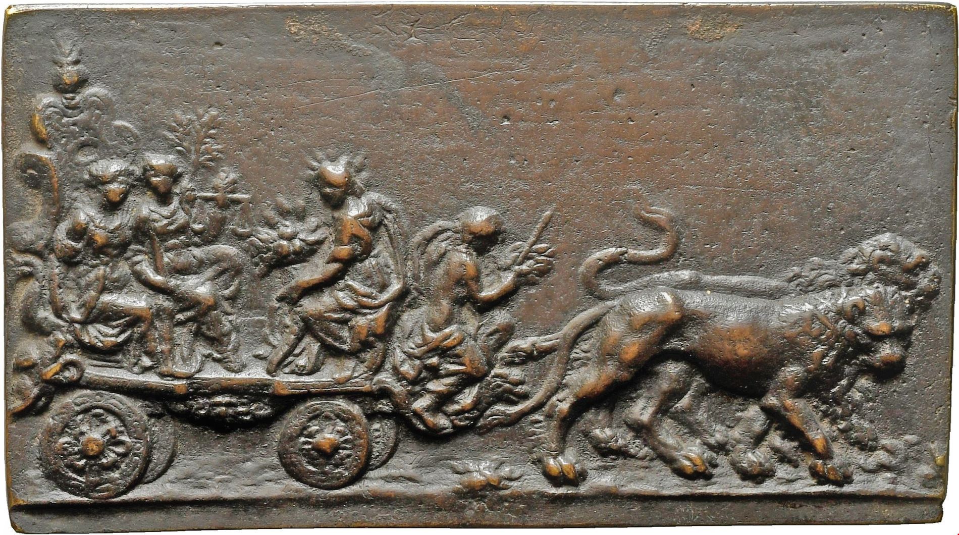 Carro di vimini trainato da due asini; la POVERTÀ è seduta sopra la scritta INOPIA; seduta frontalmente, l’UMILTÀ con una verga in mano e sopra la testa VMI; alla guida del carro, la PAURA con frusta in mano e la scritta TIM; accanto alle ruote, la SCHIAVITÙ, che regge delle catene, e la PAZIENZA, che porta sulle spalle un grosso masso; dietro gli asini una figura maschile. Sullo sfondo a destra, un edificio con croce. Bella fusione antica.
