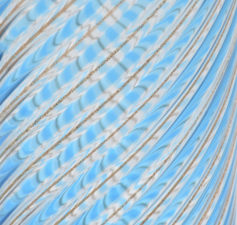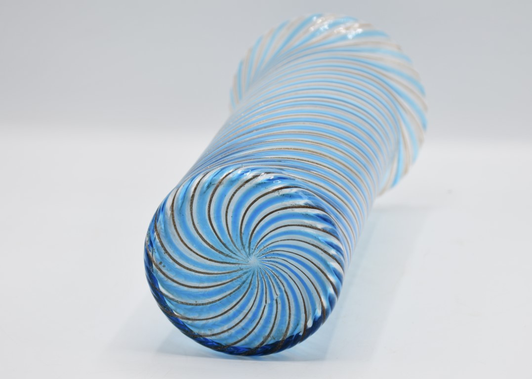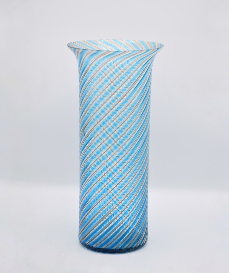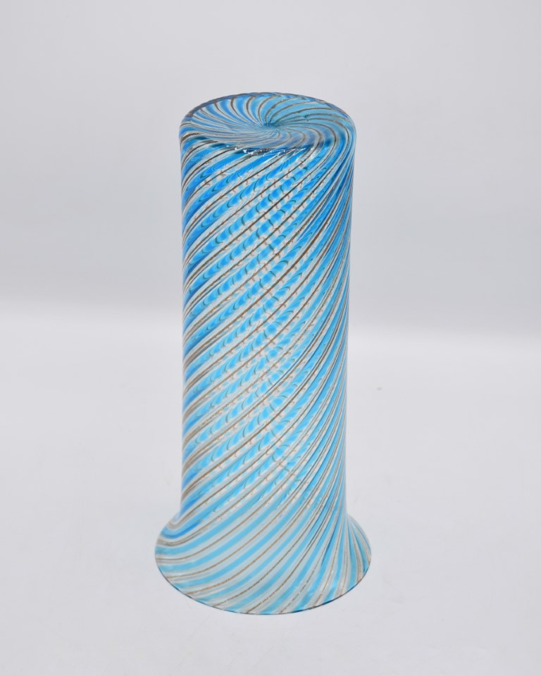 Realizzato in vetro trasparente con lavorazione a mezza filigrana con canne nei toni azzurro e oro, corpo cilindrico con collo lievemente svasato