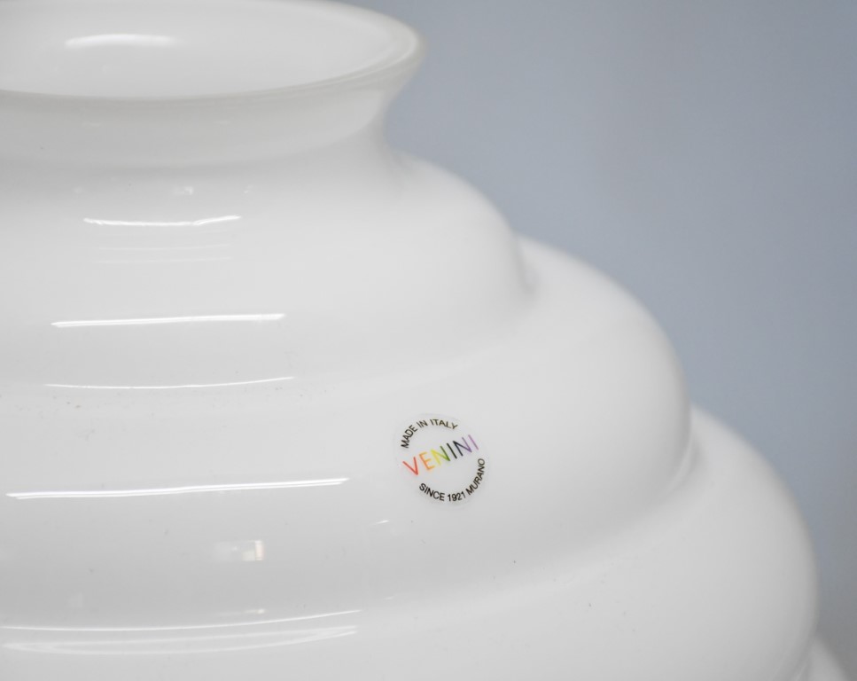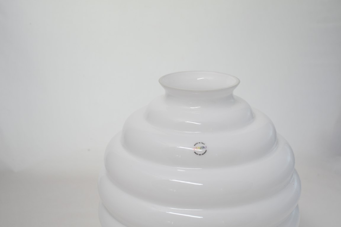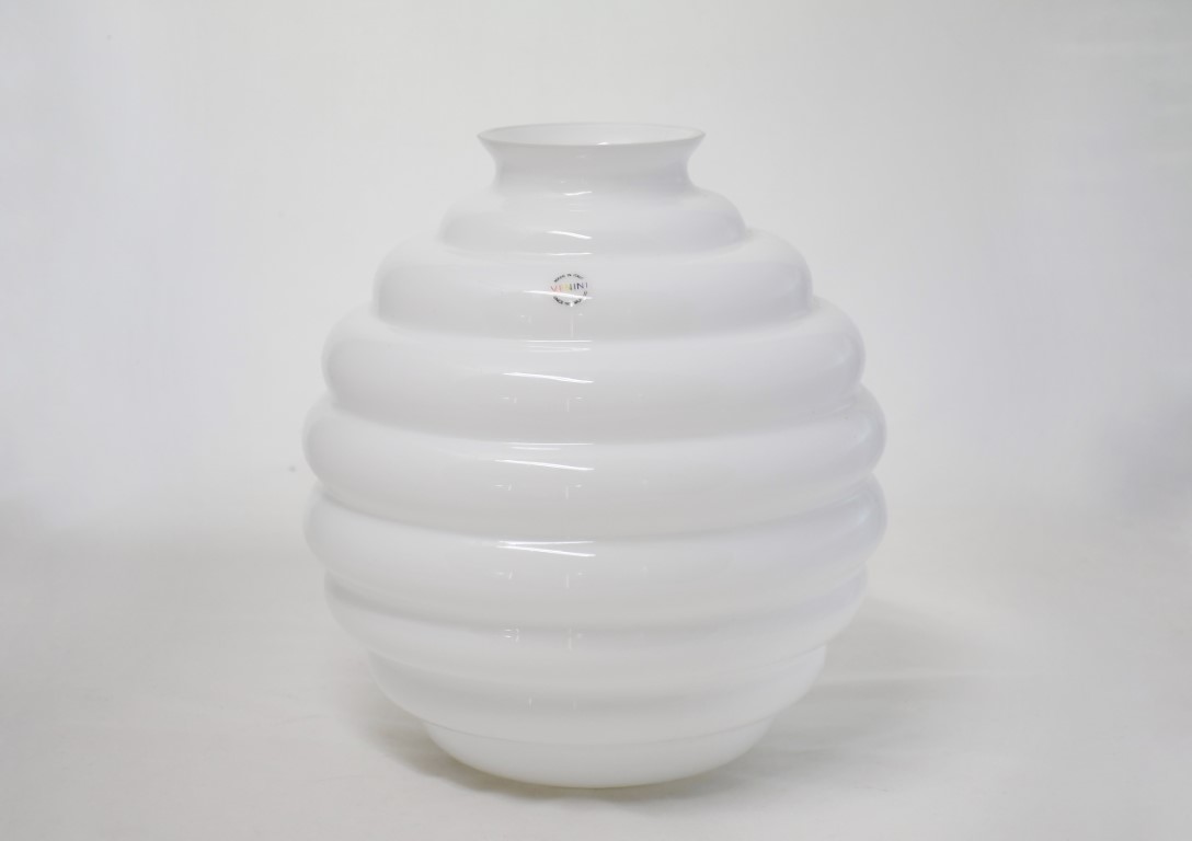 In vetro soffiato opalino nei toni bianco, corpo globulare e breve collo