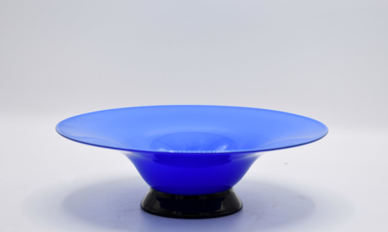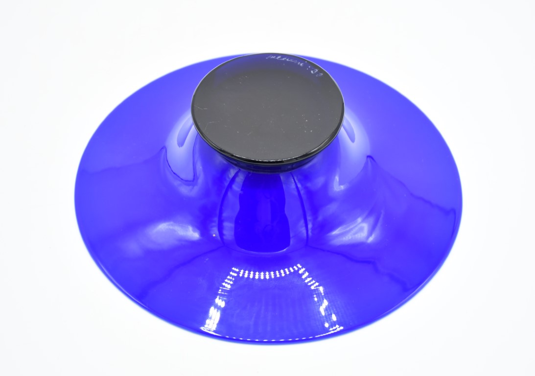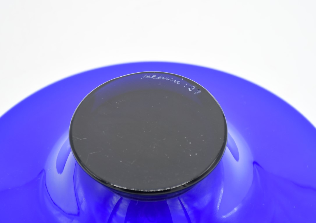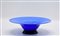 Realizzato in vetro blu di forma circolare lievemente eversa, struttura d'appoggio in vetro nero