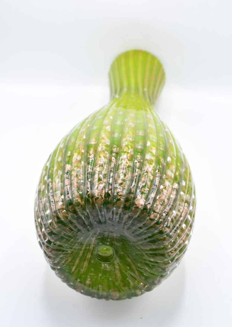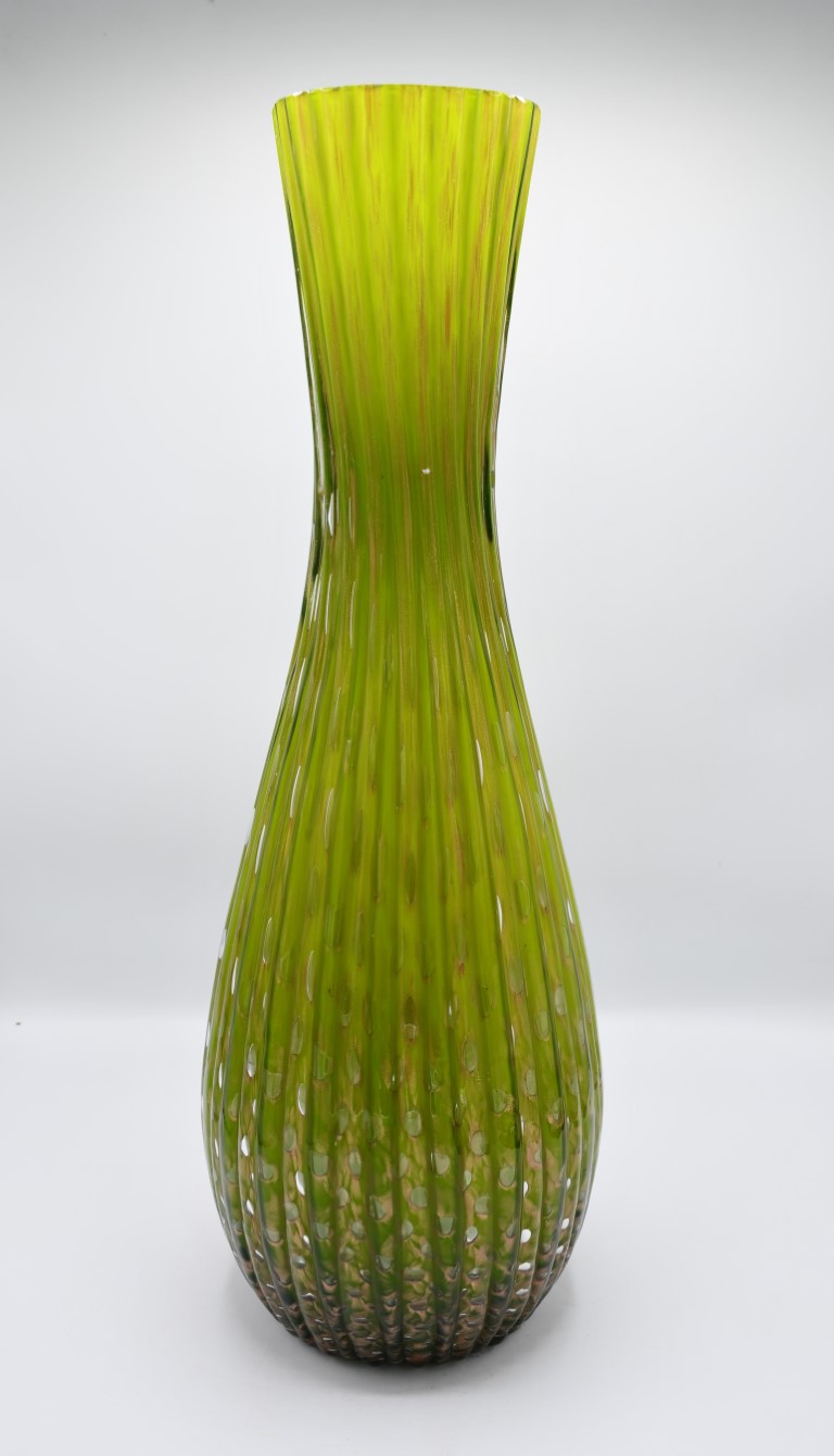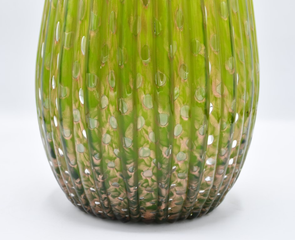 Grande vaso in vetro di forma allungata con lavorazione bulicante, impreziosito da inclusioni a foglia d'oro