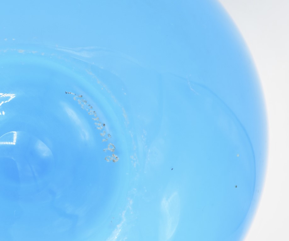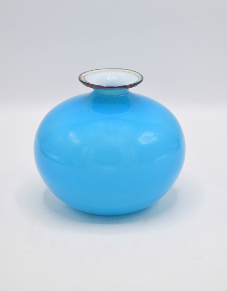 Piccolo vaso globulare con breve collo in vetro opalino incamiciato azzurro e bianco