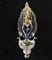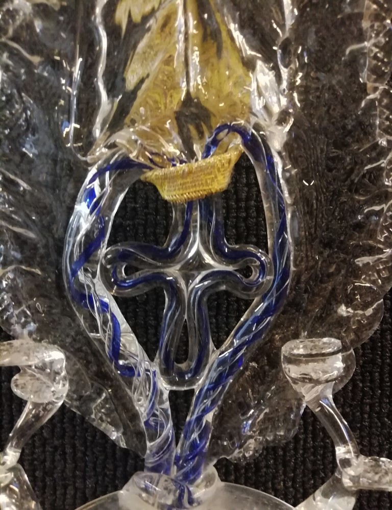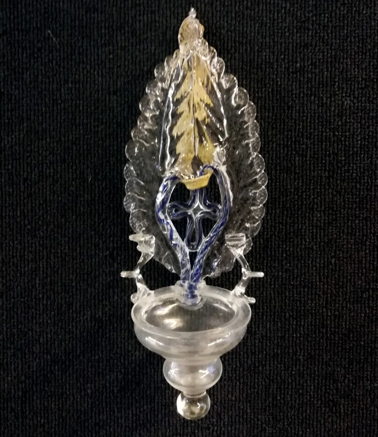 Acquasantiera interamente realizzata in vetro di Murano. Struttura superiore in cristallo a simulare una fiamma al cui interno trova posto una croce in vetro blu. Alla base vaschetta per l'acqua in vetro lievemente opalino. L'acquasantiera in oggetto è interessante anche dal punto di vista storico. Quando è presente la croce, infatti, si intende da porre sopra ad un letto singolo, ad una piazza. Nel caso di letto matrimoniale sono presenti simboli identificativi differenti come il Cuore del Cristo e il Cuore della Madonna.