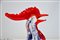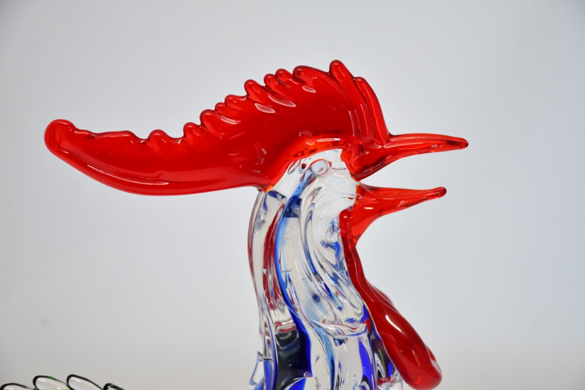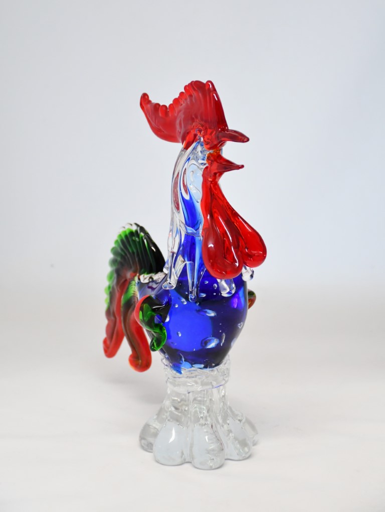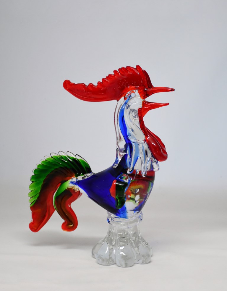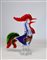 Figura di volatile realizzata in vetro sommerso nei toni del rosso, verde e blu