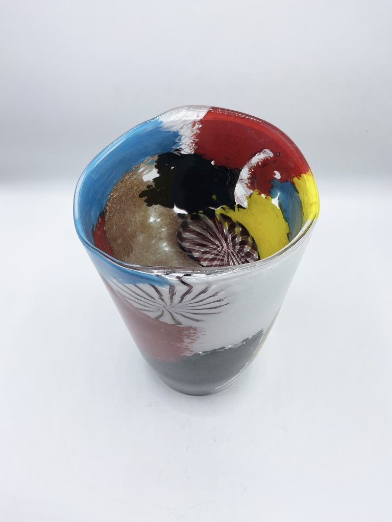 Realizzato a forma cilindrico con apertura superiore dal profilo lievemente irregolare, decoro a tessere policroma, canne di zanfirico, avventurina, grande murena a stella bianca e nera