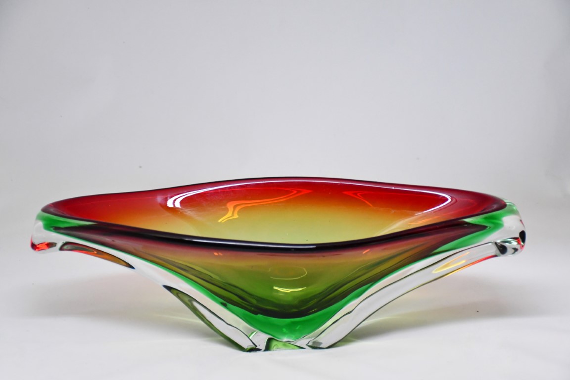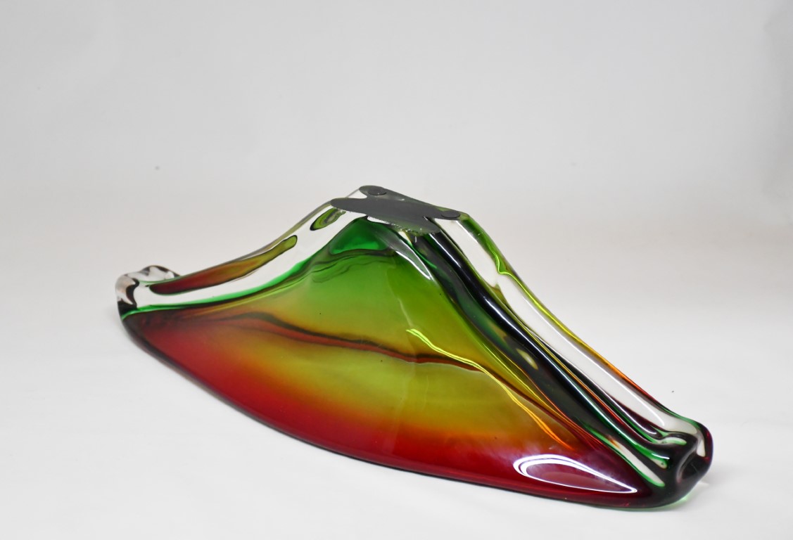 In vetro sommerso, a cappello napoleonico nei toni del verde, giallo e rosso