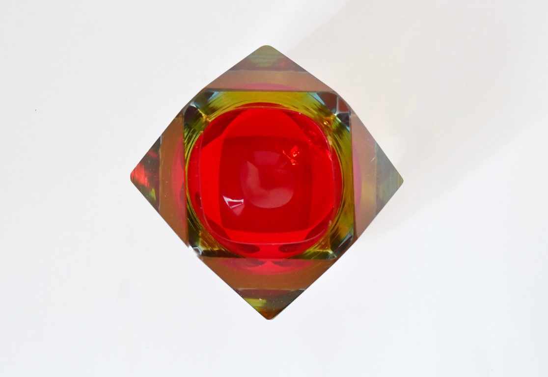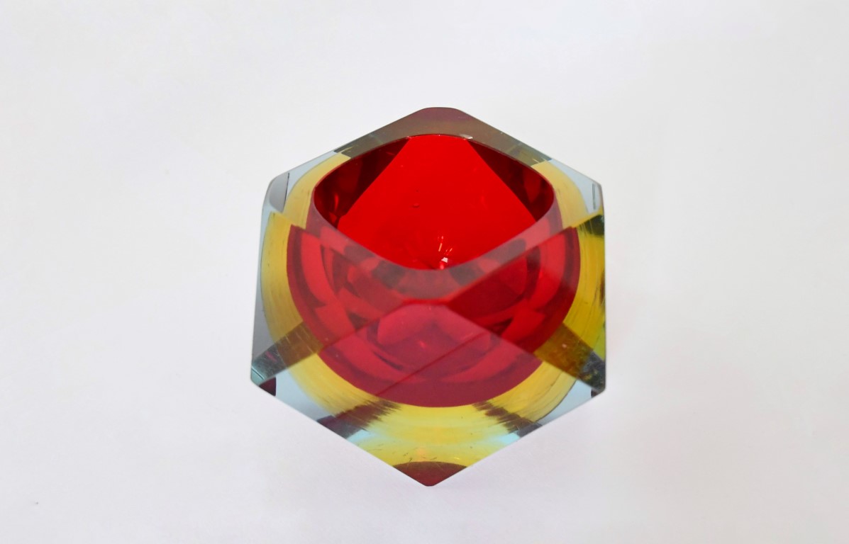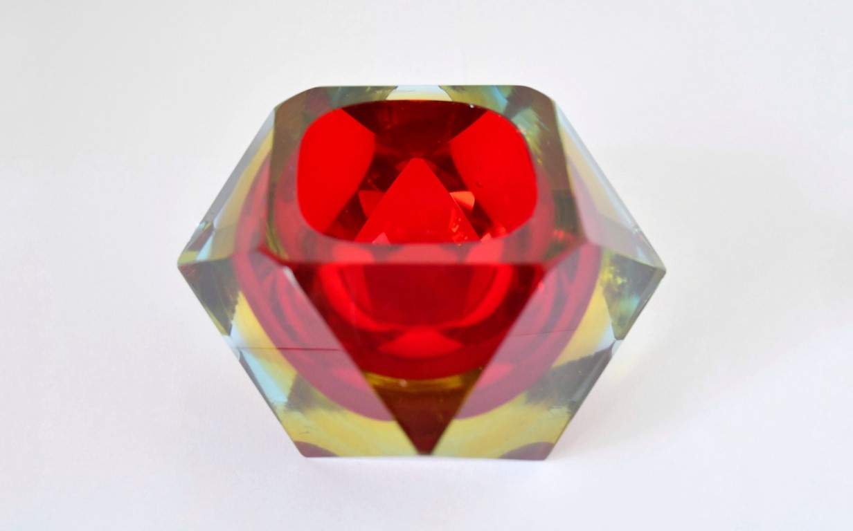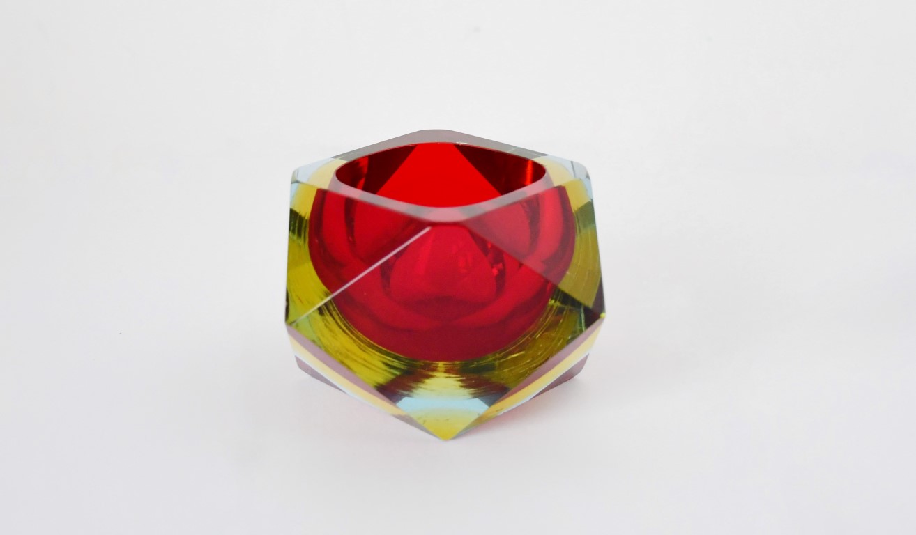 Realizzato in vetro sommerso a taglio diamante nei toni del rosso e del giallo
