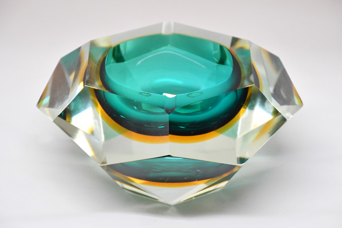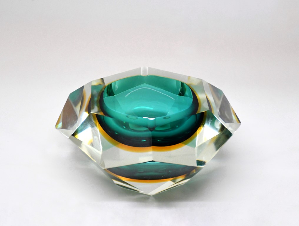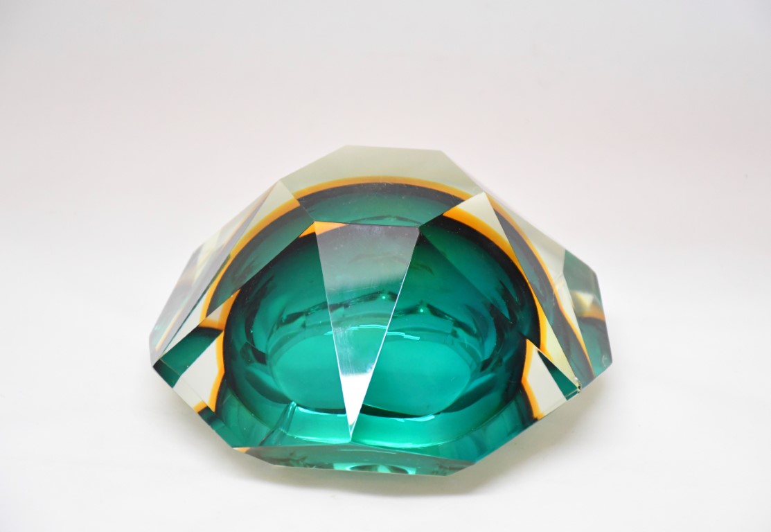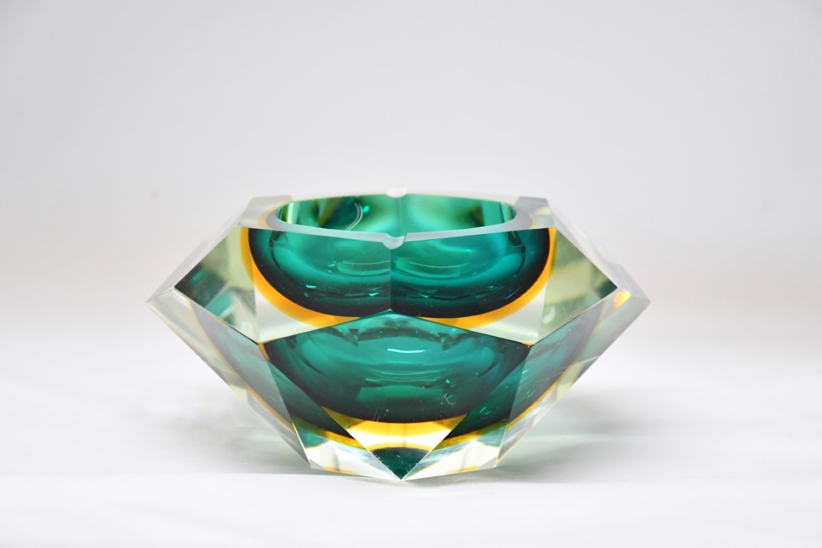 Realizzato in vetro sommerso a taglio diamante nei toni del verde e del giallo