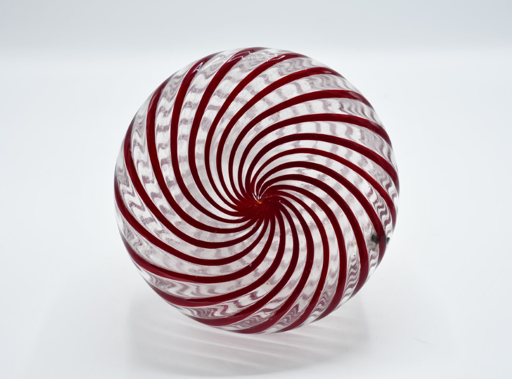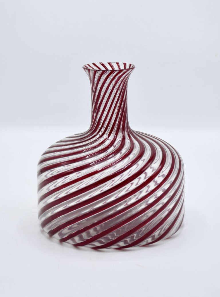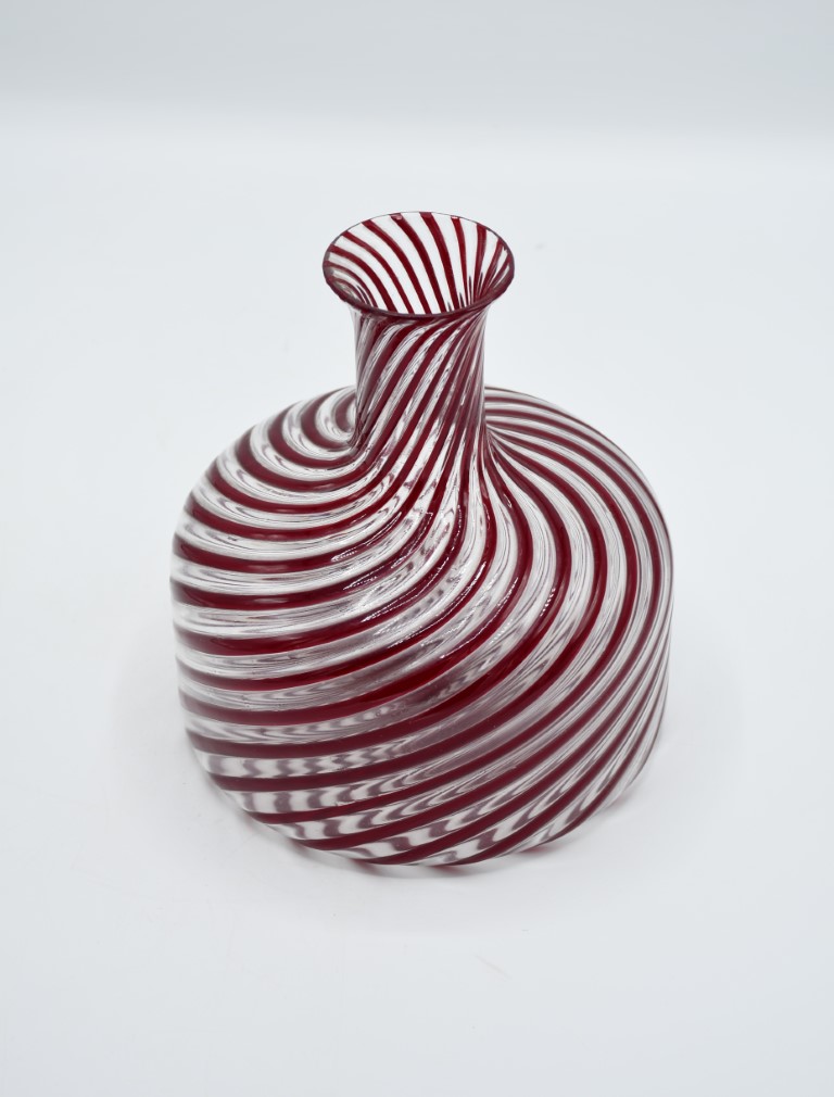 Realizzata in vetro trasparente con lavorazione a canne ritorte nei toni del rosso scuro