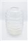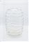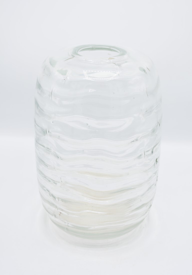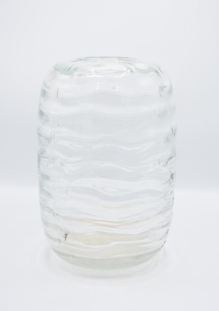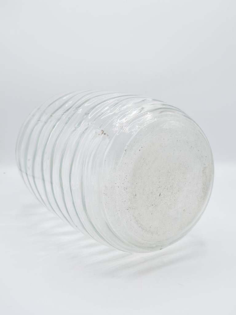 Realizzato in vetro incolore di forma cilindrica con grande apertura nella parte superiore, decoro a fasce orizzontali
