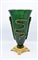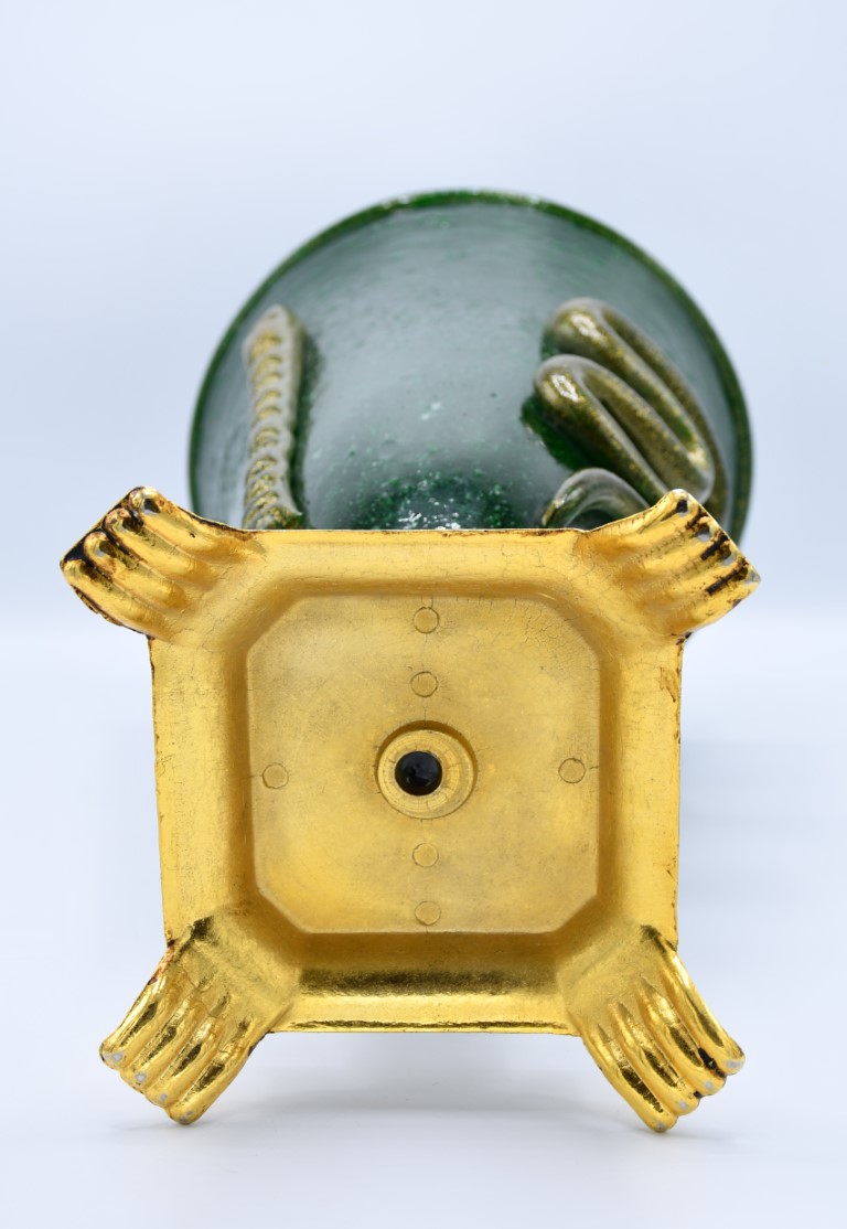 Realizzato in vetro pulegoso verde con applicazioni a forma di serpente e nastri ondulati con foglia d'oro