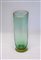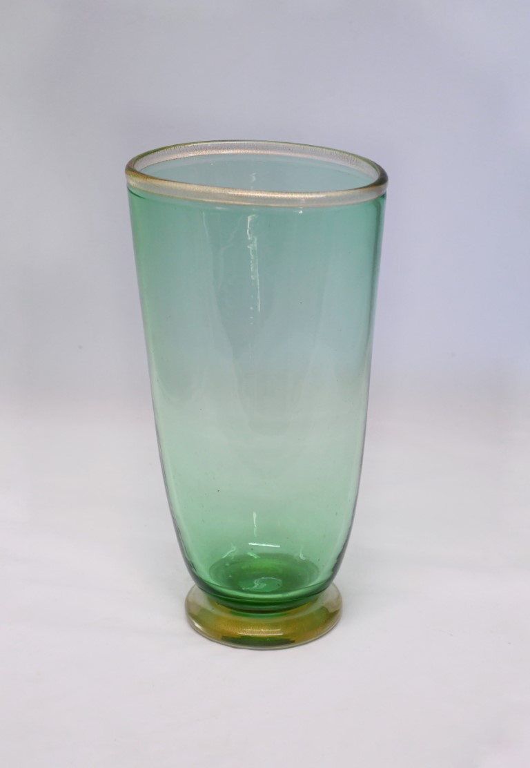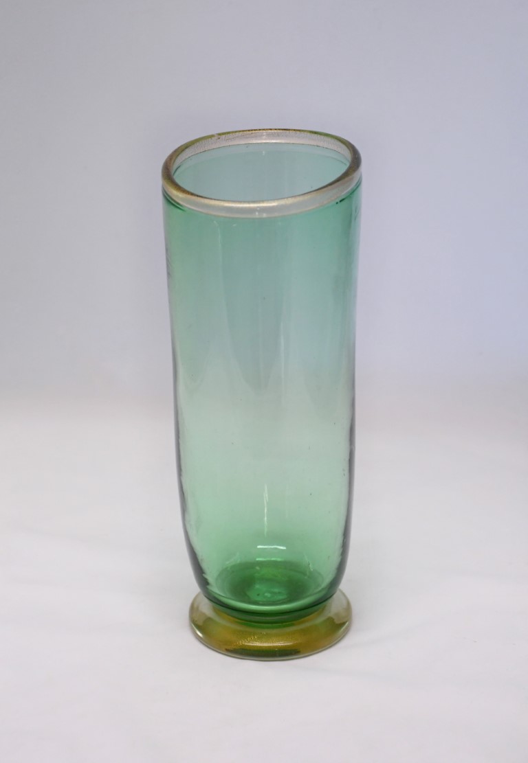 Realizzato a forma cilindrica leggermente schiacciata, in vetro soffiato sui toni del verde con inclusioni di foglia d'oro