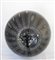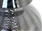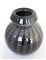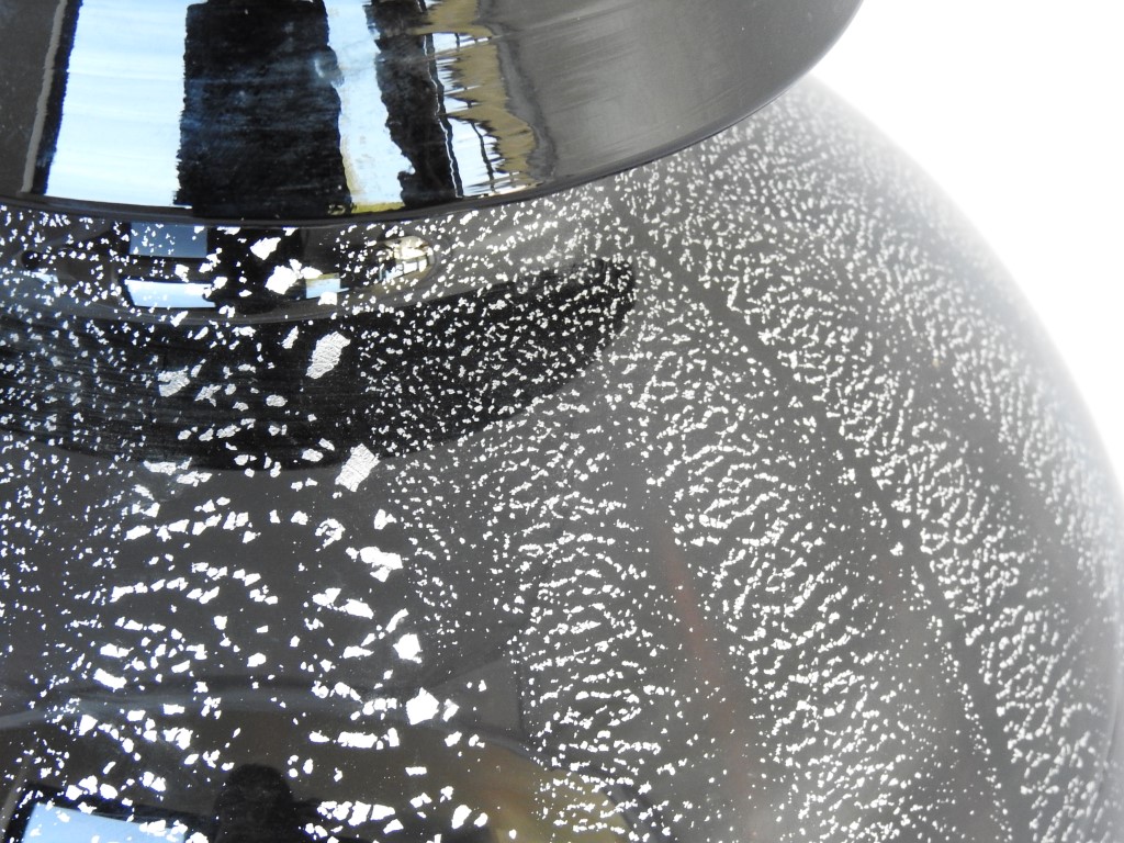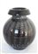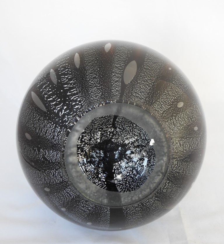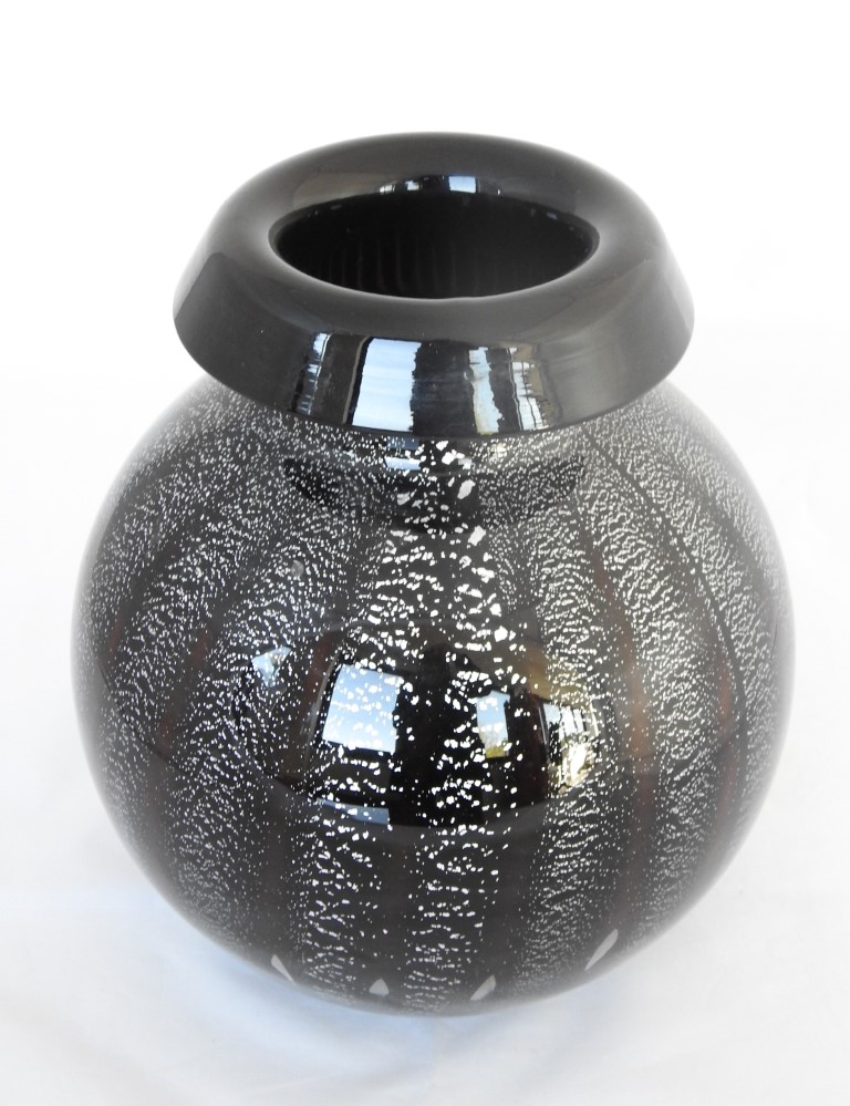 Realizzato in vetro nei toni del nero e rosso con decoro a canne verticali alternate da una decorazione arabescata con inclusioni d'argento, corpo globulare, breve collo, ampia apertura nella parte superiore