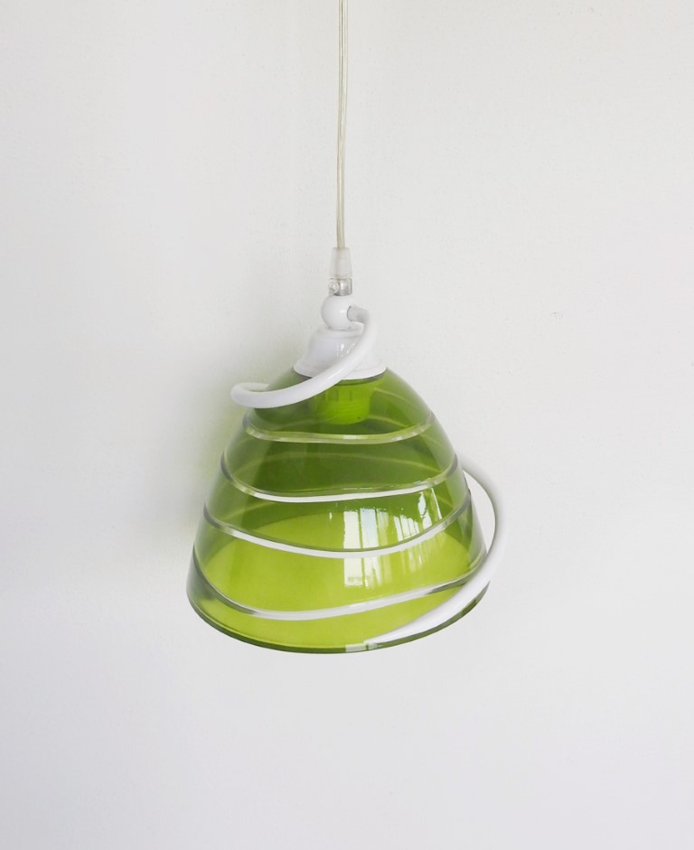 Realizzata in vetro nei toni del verde con spirale trasparente con aggiunta esterna di metallo laccato bianco a spirale