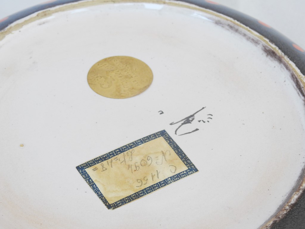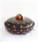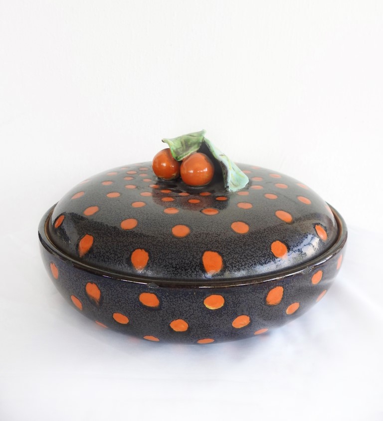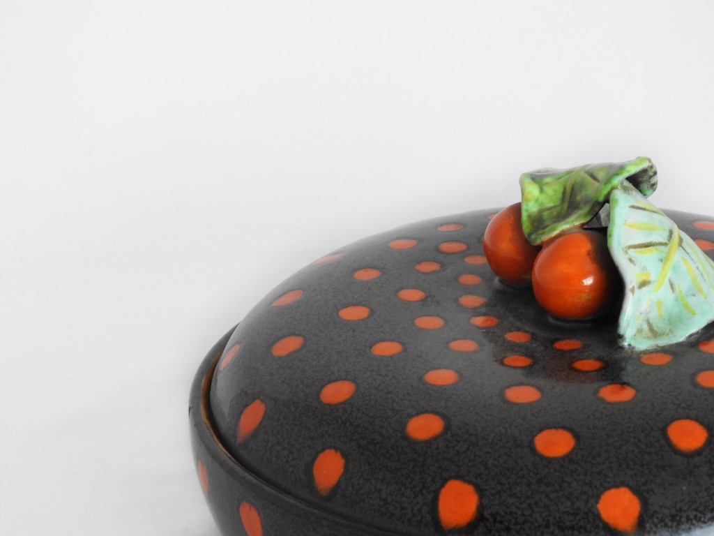 Realizzata in ceramica a pois rossi su sfondo scuro, presa a foggia di ciliegie