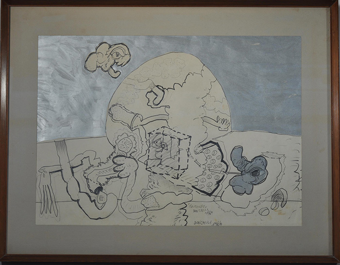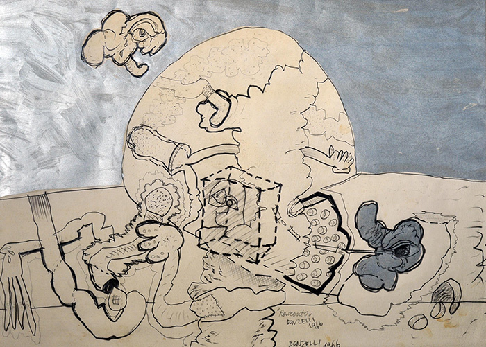 Donzelli Bruno (Napoli 1941) Racconto tecnica mista su carta, cm 43x60 firmato datato e iscritto in basso a destra: Racconto Donzelli 1966