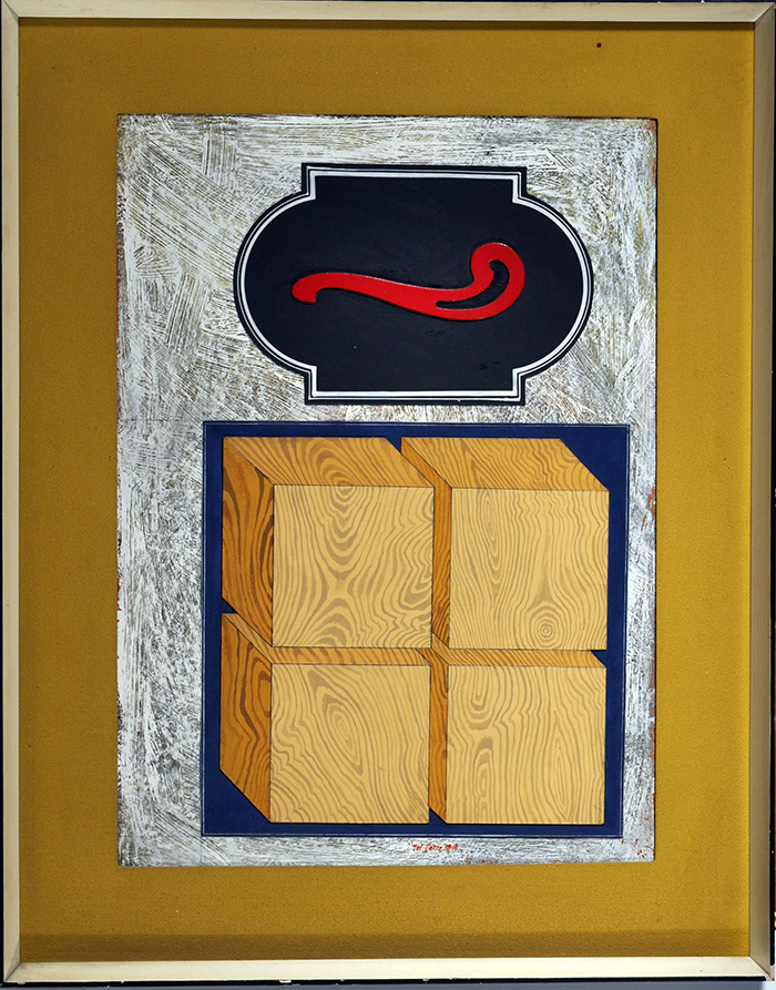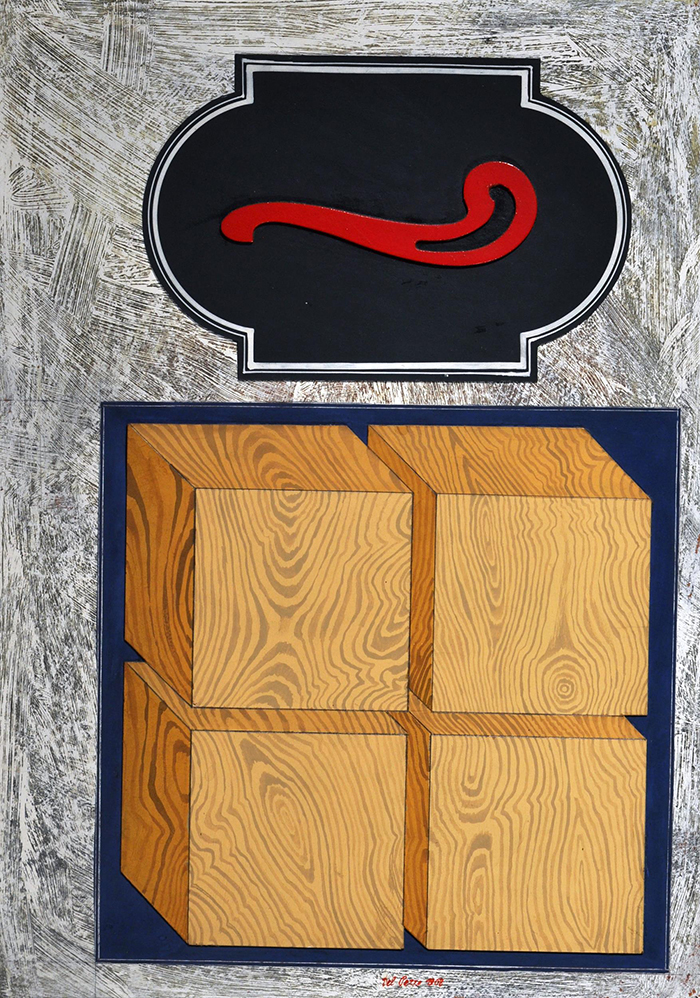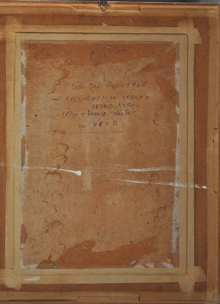 Del Pezzo Lucio (Napoli 1933 - Milano 2020) Elementi in legno e segno rosso collage e tecnica mista su tavola cm 46x30 firmato e datato in basso al centro: Del Pezzo 1968