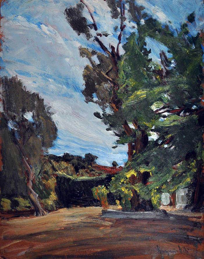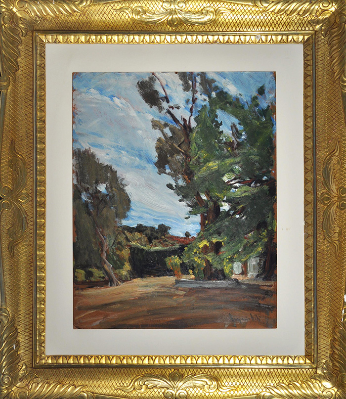 Viti Eugenio (Napoli 1885 -1952) Paesaggio olio su cartone, cm 49x38 firmato in basso a destra: Eugeio Viti a tergo timbro Galleria Mediterranea, Napoli