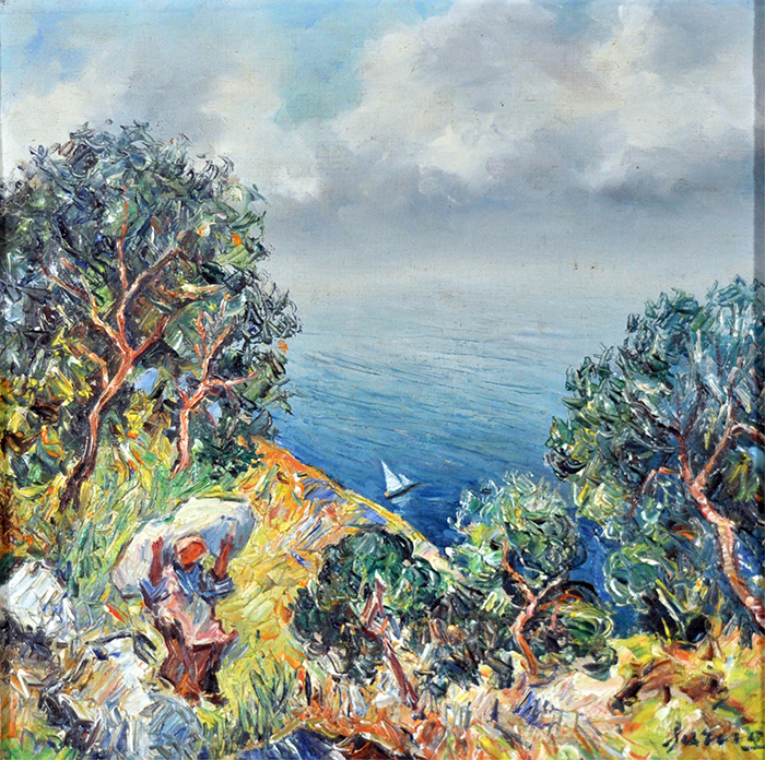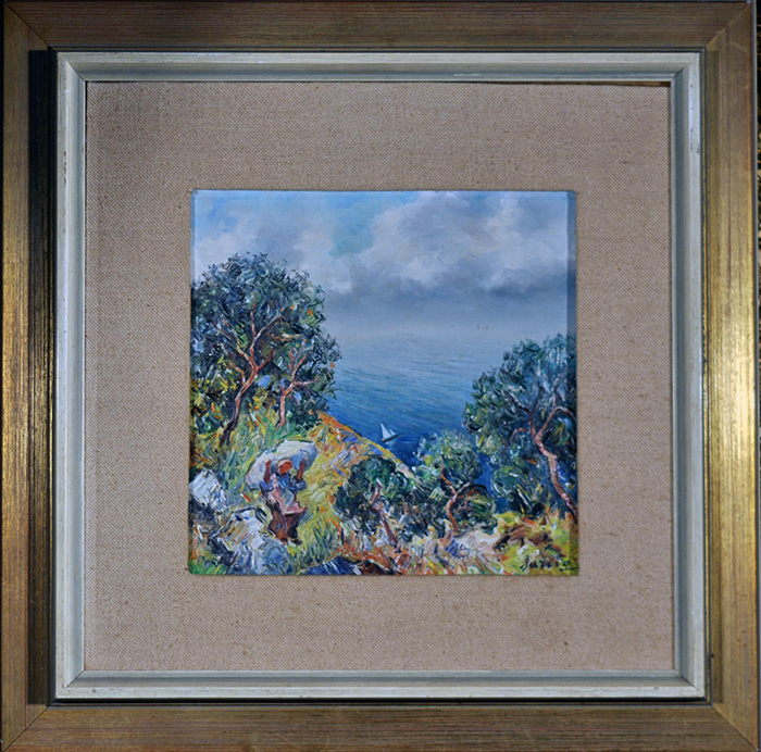 Sarno Matteo (Ischia, Napoli 1894 – 1957) Paesaggio caprese olio su tela rip. su cartone, cm 26x26 firmato in basso a destra: Sarno