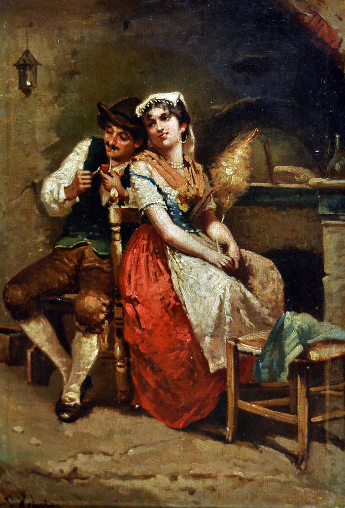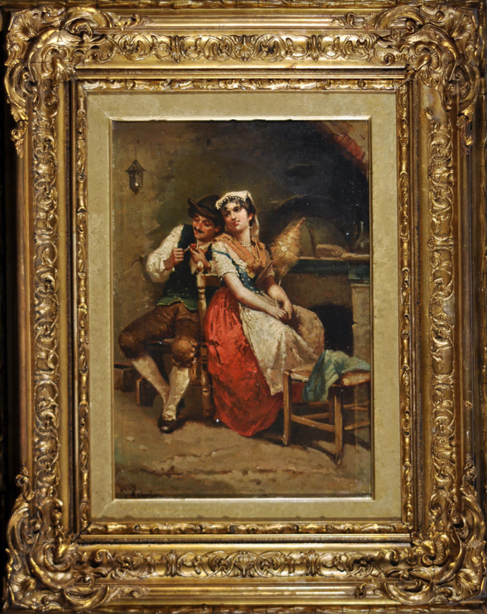Peluso Francesco (Napoli 1836 - dopo il 1916) Corteggiamento olio su tela, cm 40x26,5 firmato in basso a sinistra: F. Peluso