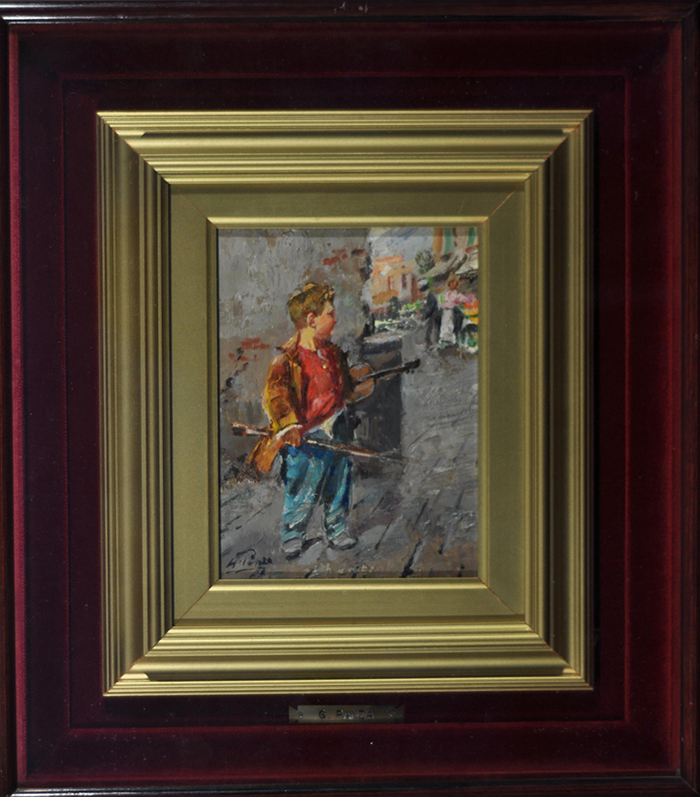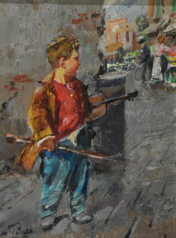 Panza Giovanni (Napoli 1894 - 1989) Piccolo musicista olio su tavola, cm 20x15 firmato in basso a sinistra: G. Panza