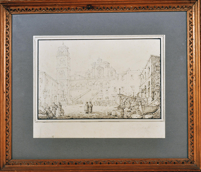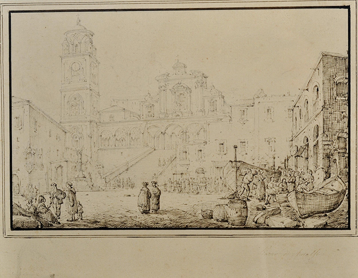 Senape Antonio (1788 - 1850) Amalfi con Duomo seppia su carta, cm 17x26