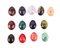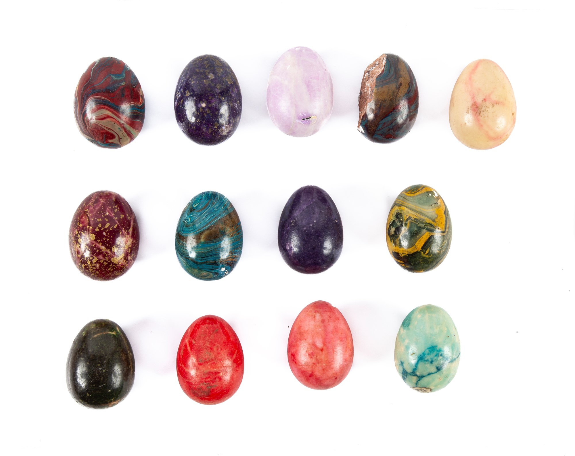 Raccolta di tredici uova in pietra dipinta ognuno differentemente decorato di fantasia ad imitazione del marmo. Uno rotto cm 6 ca. ognuno