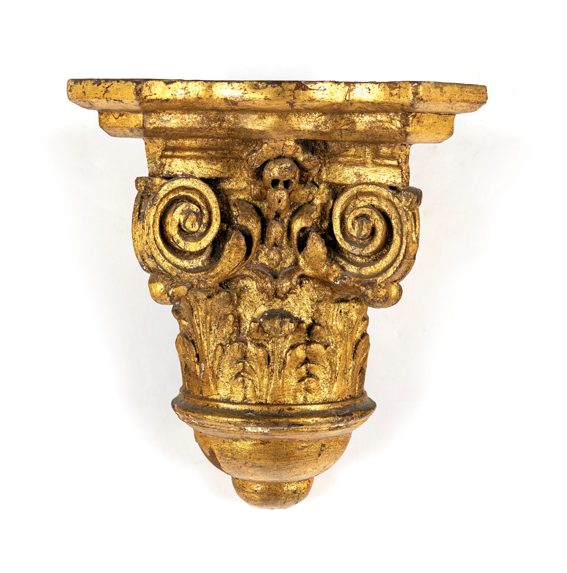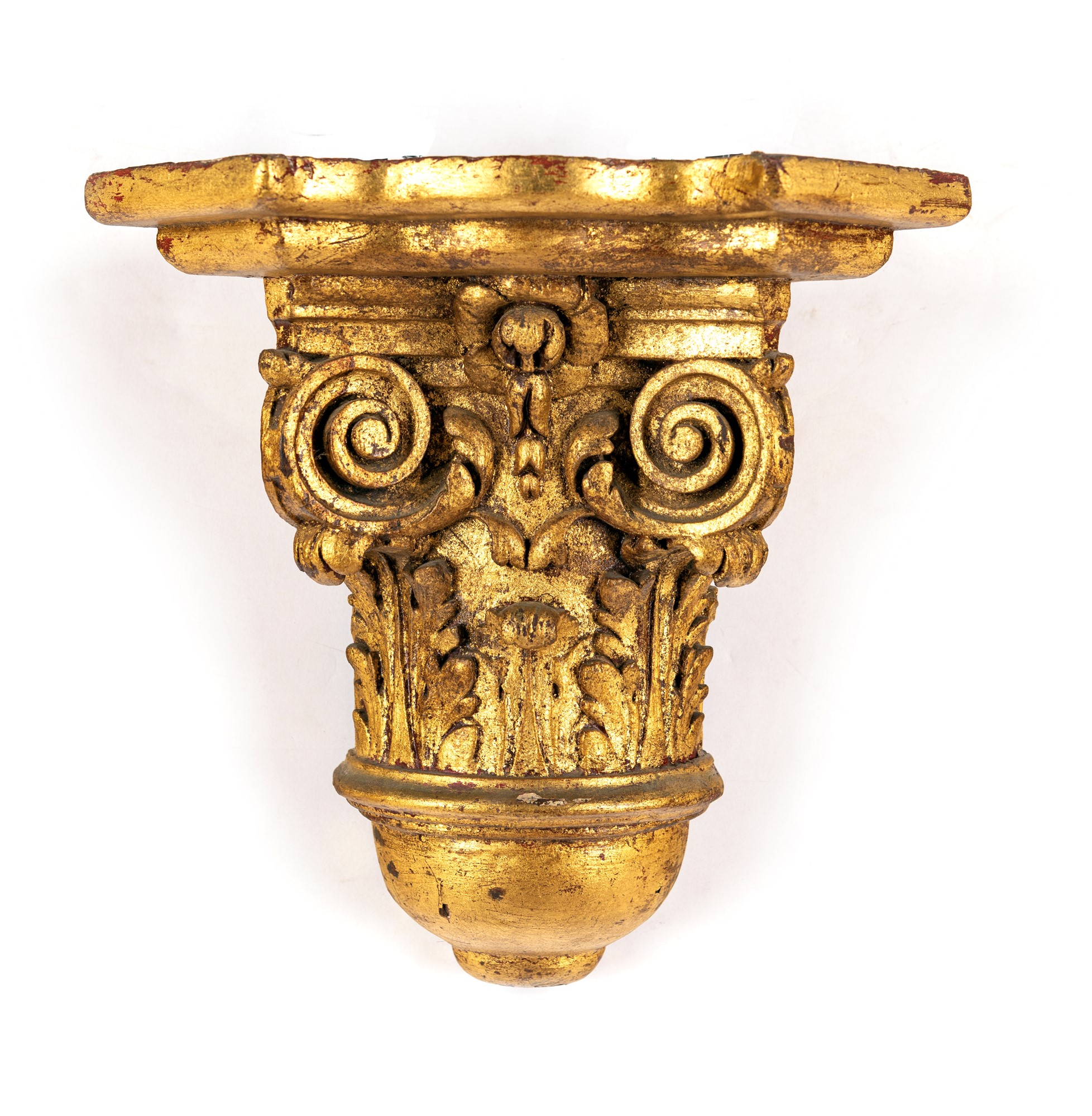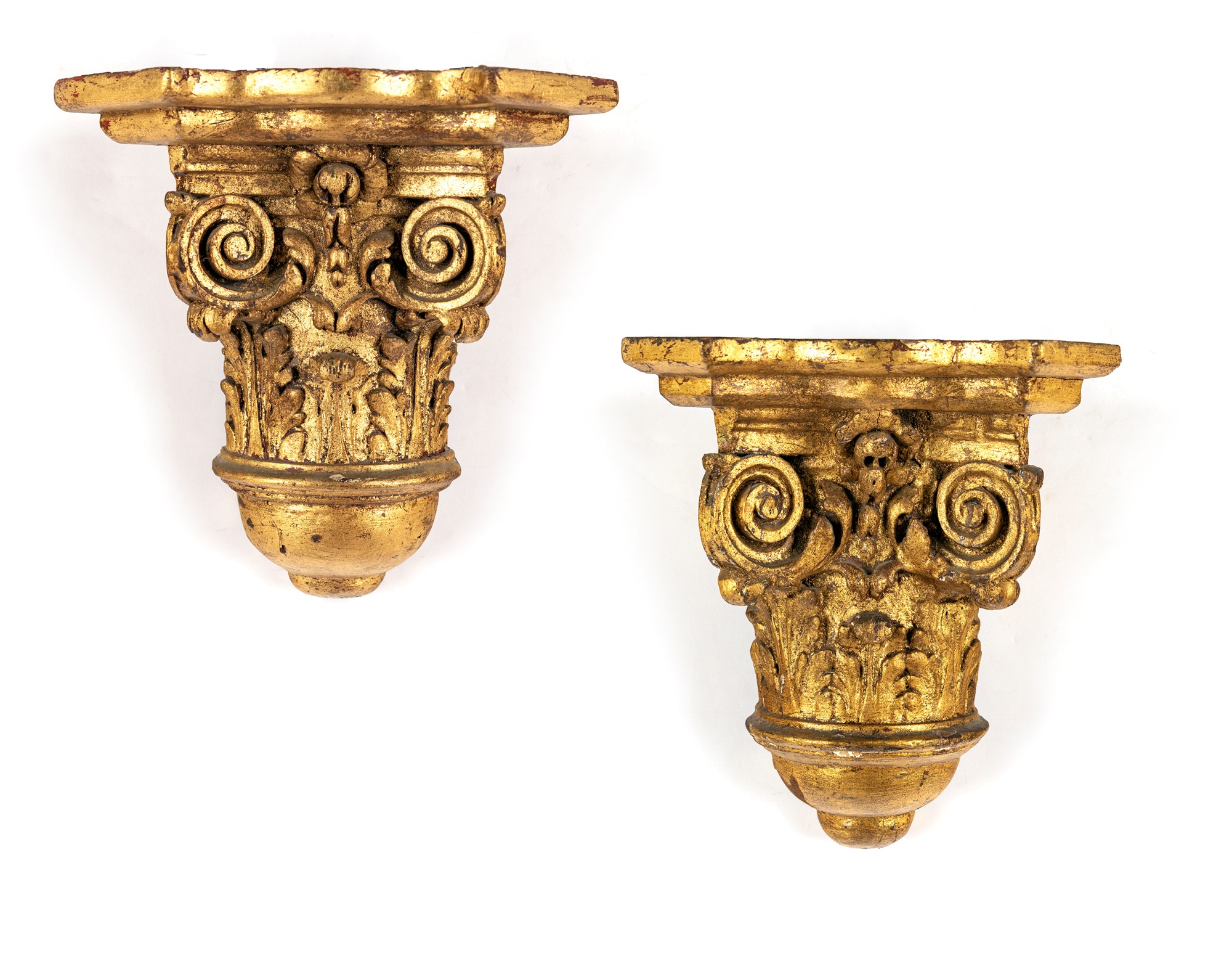 Coppia di mensole in legno intagliato e dorato a forma di capitello, XIX secolo
