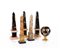 Cinque piccoli obelischi in marmi vari ed una sfera in commesso geometrico