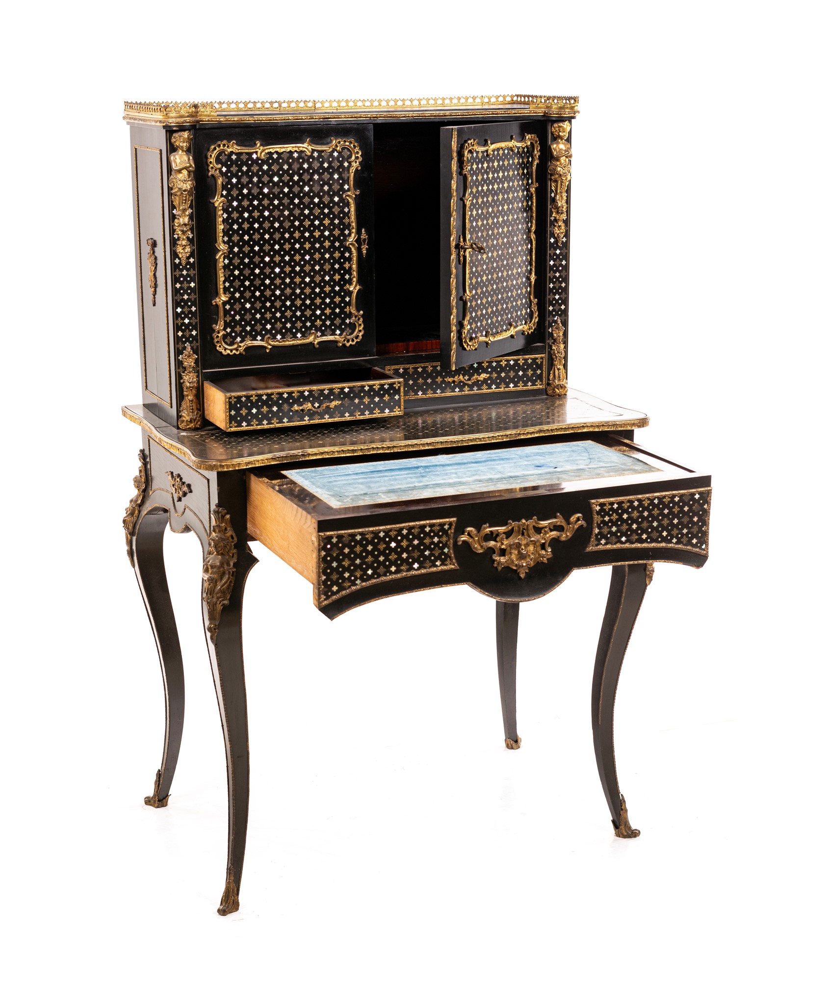 Bonheur du jour in legno ebanizzato con intarsi in rame dorato e madreperla, Francia, Napoleone III