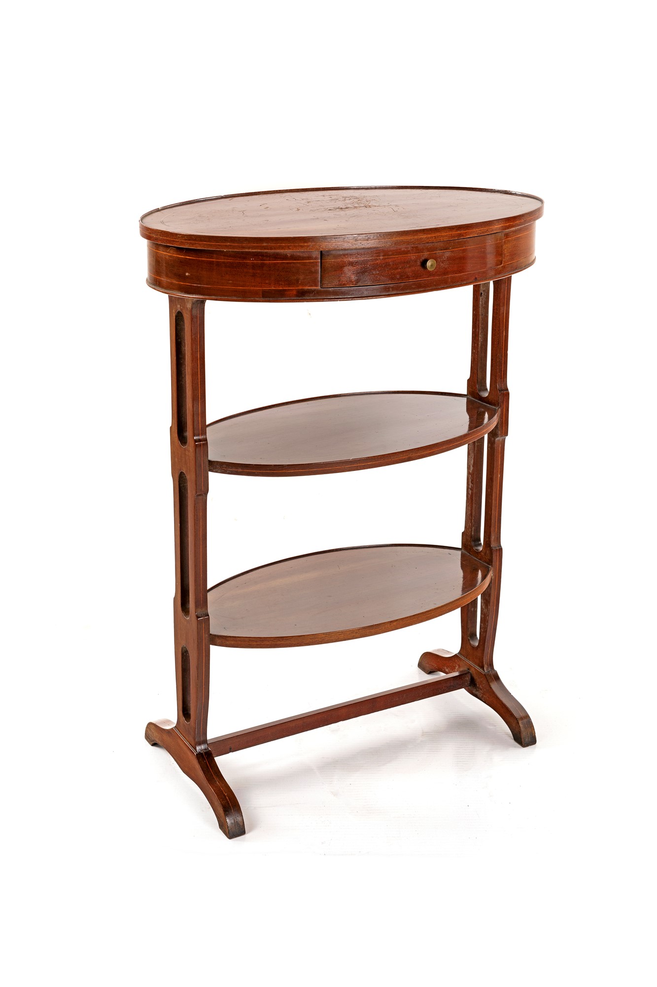 Piccolo tavolino ovale in mogano a tre piani, XIX secolo un cassetto nella fascia, sostegni laterali diritti riuniti da traverse cm 80x60x35,5