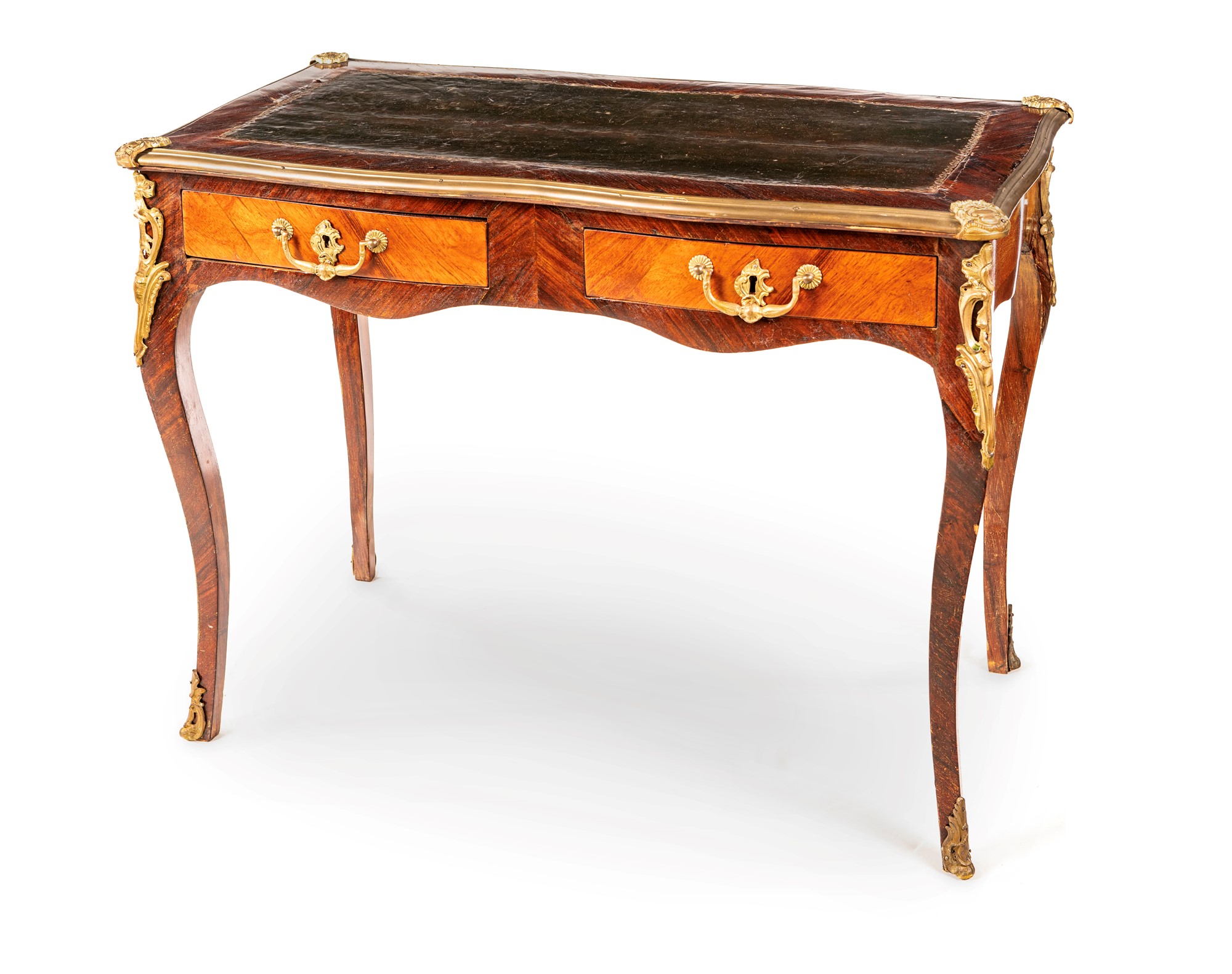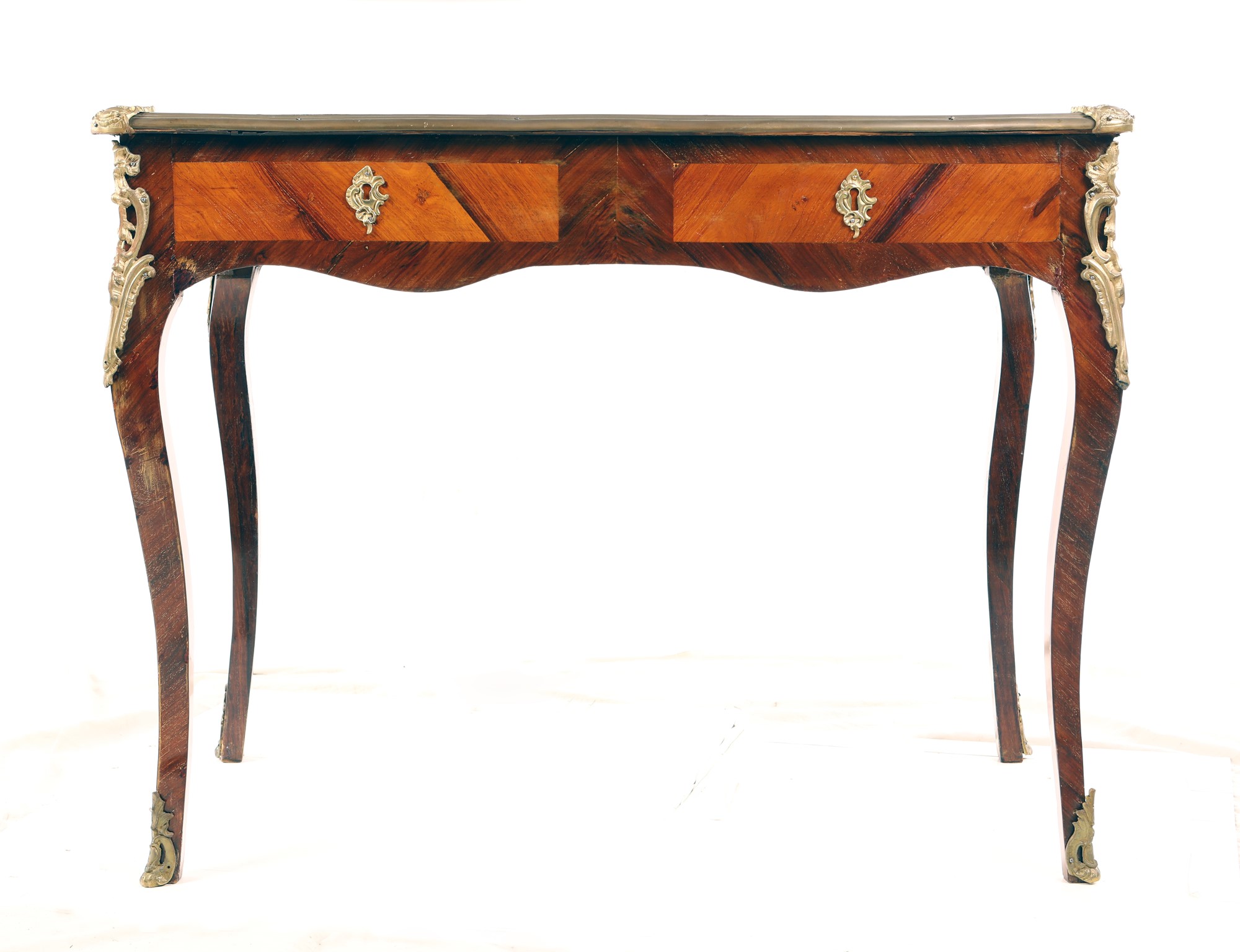 Piccola scrivania d'epoca Napoleone III con finiture ornamentali in bronzo dorato; piano rettangolare sagomato, due cassetti in linea nella fascia, gambe sagomate cm 76x99x53