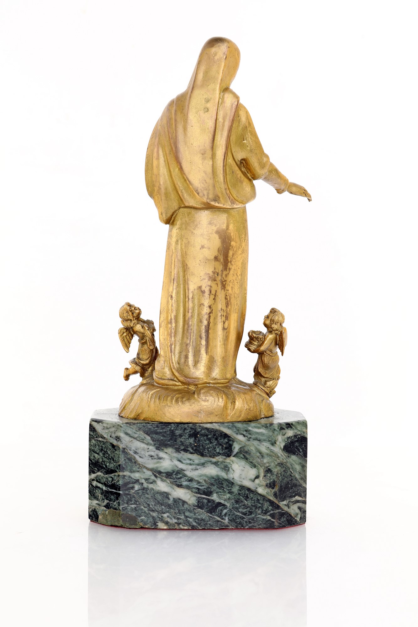 Vergine in metallo dorato, inizi del XX secolo affiancata da piccole figure di angelo; base in marmo verde