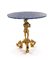 Tavolo da centro in bronzo dorato piano circolare lastronato in sodalite poggiante su figura scultorea di cortigiano con un animale in braccio, sorretto da figure di gargoyles