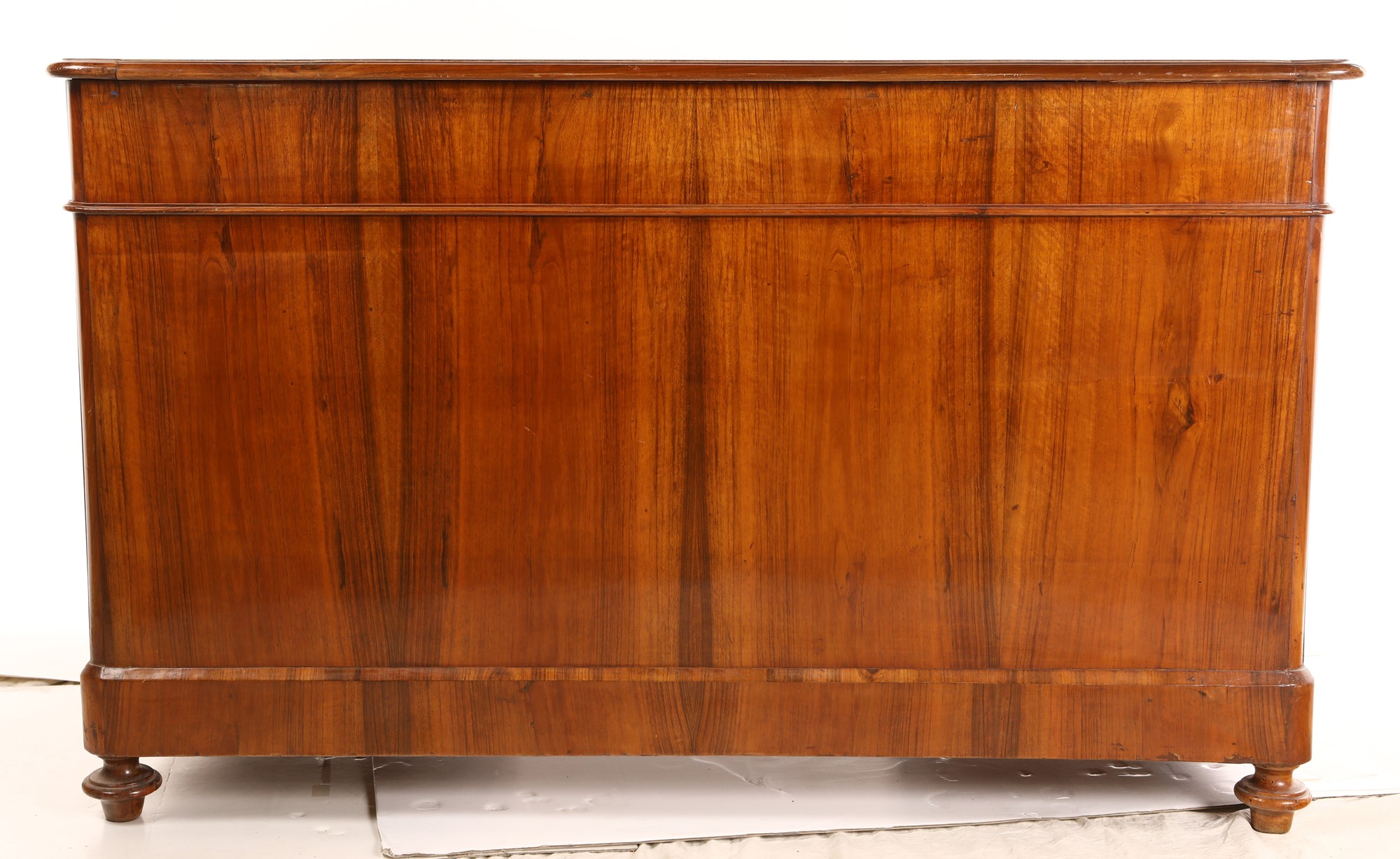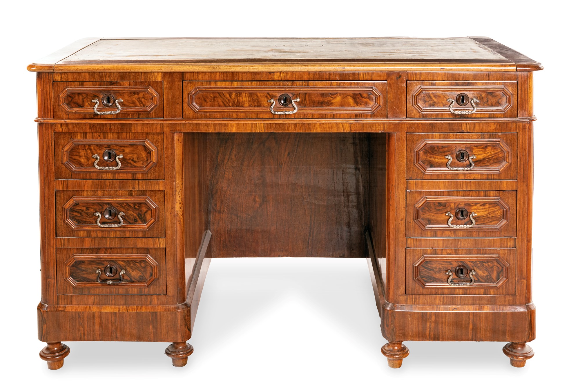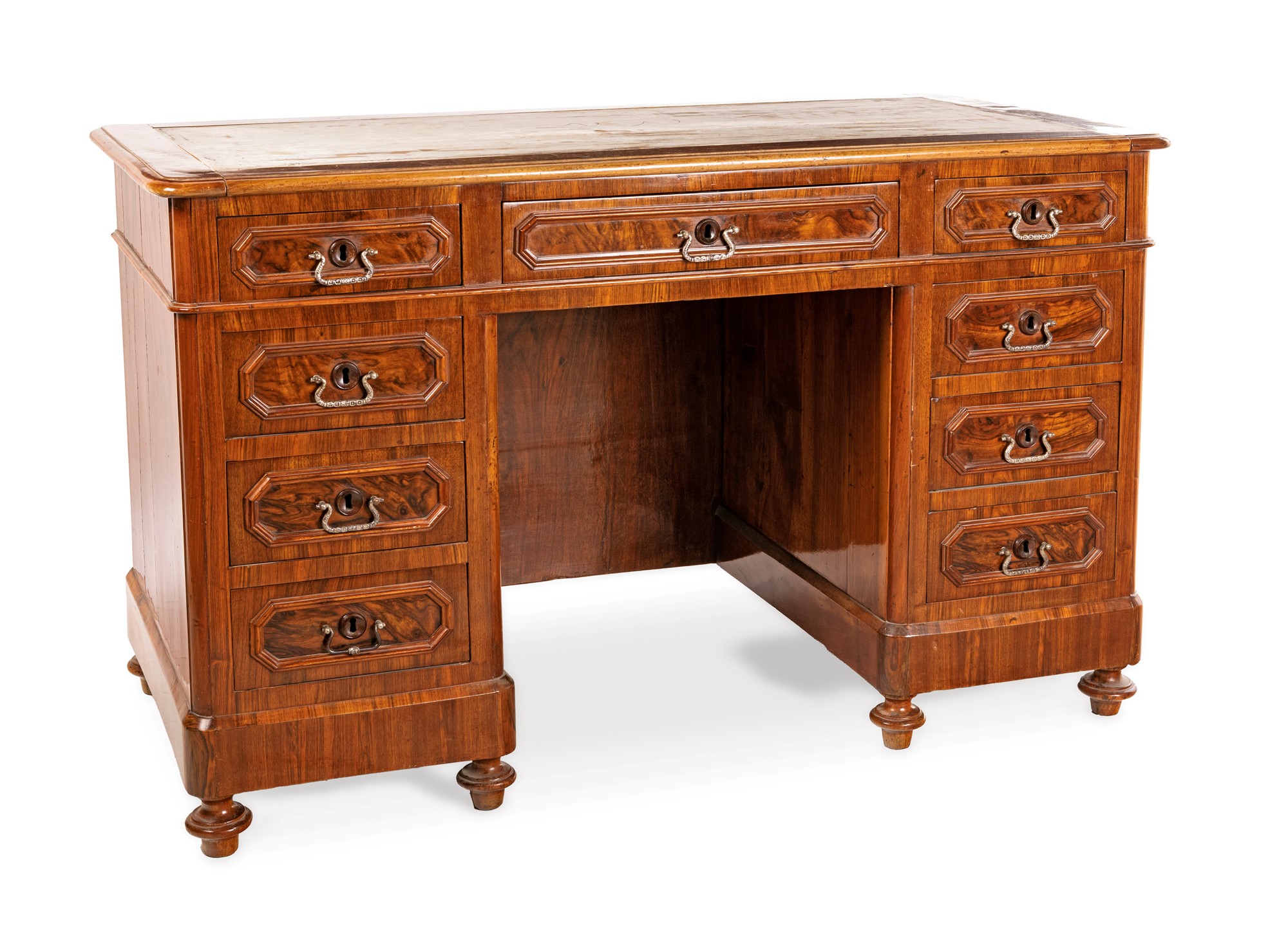 Scrivania da centro a bancone in noce, XIX secolo piano rettangolare ad angoli arrotondati privo del rivestimento in pelle, un cassetto nella fascia affiancato da quattro tiretti in colonna disposti ai lati, con riquadri incorniciati e maniglie in bronzo; piedi a trottola cm 81x133x66