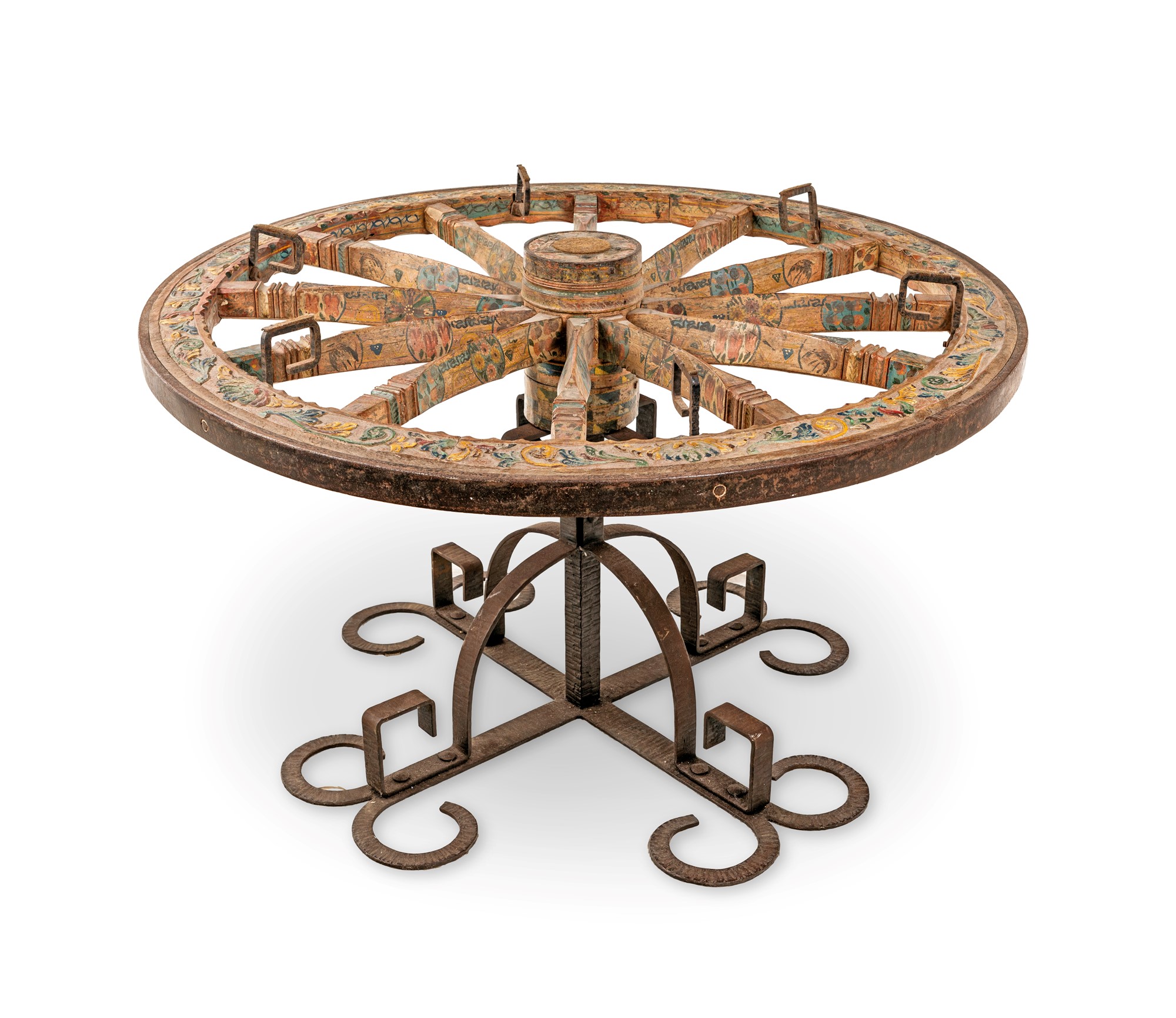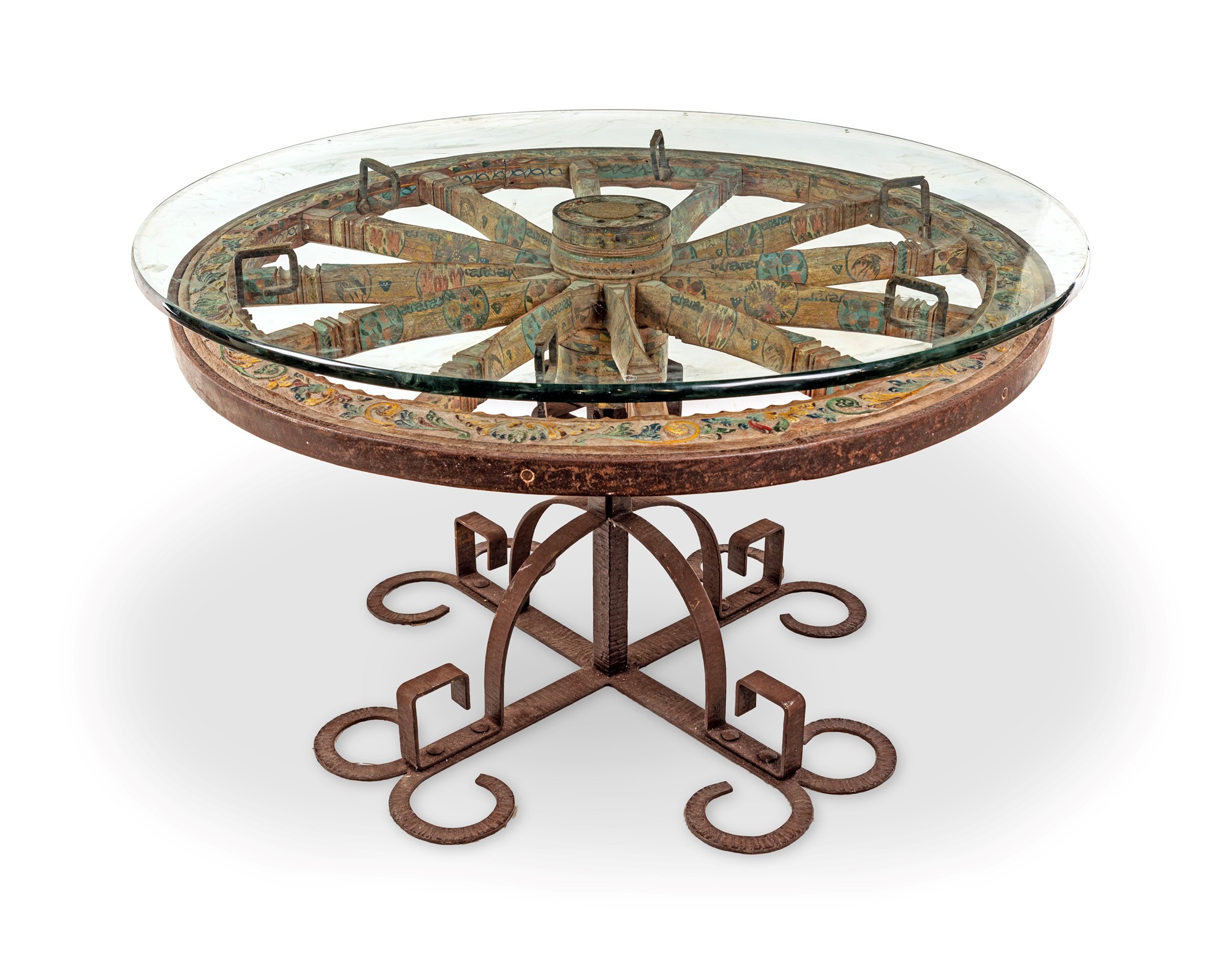 Tavolo da centro in legno e ferro battuto con piano costituito da un'antica ruota di carro siciliano in legno intagliato e dipinto, sormontata da un piano in cristallo poggiante su supporti in ferro cm 79x128 (completo di piano in cristallo)