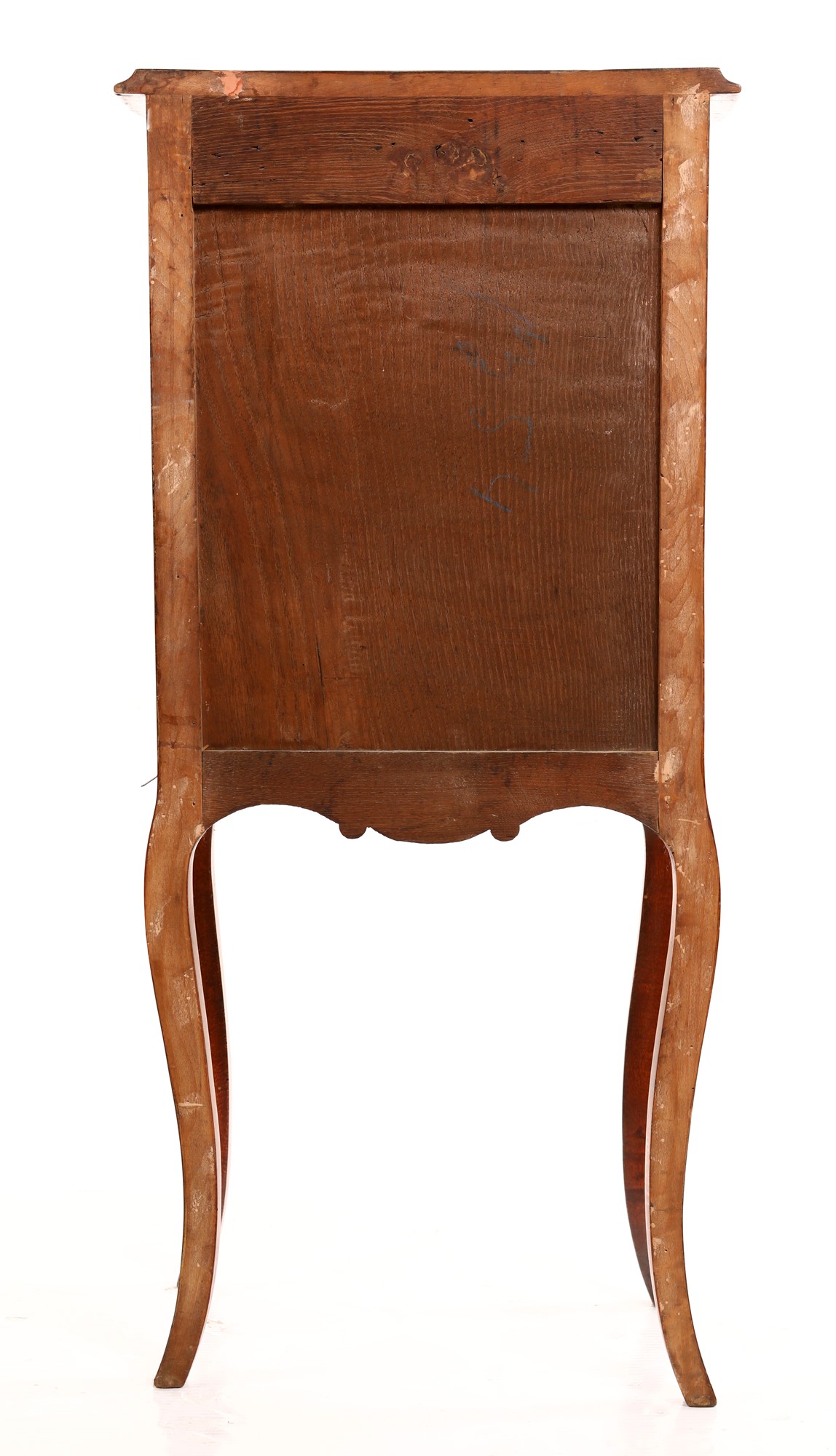 Piccolo mobile in legno con intarsi in rame e madreperla, inizi del Novecento decorato da esili tralci "a colpo di frusta"; en suite con il lotto precedente, reca facciata lievemente sagomata suddivisa in quattro cassetti, gambe anteriori mosse, posteriori diritte cm 90x46x28