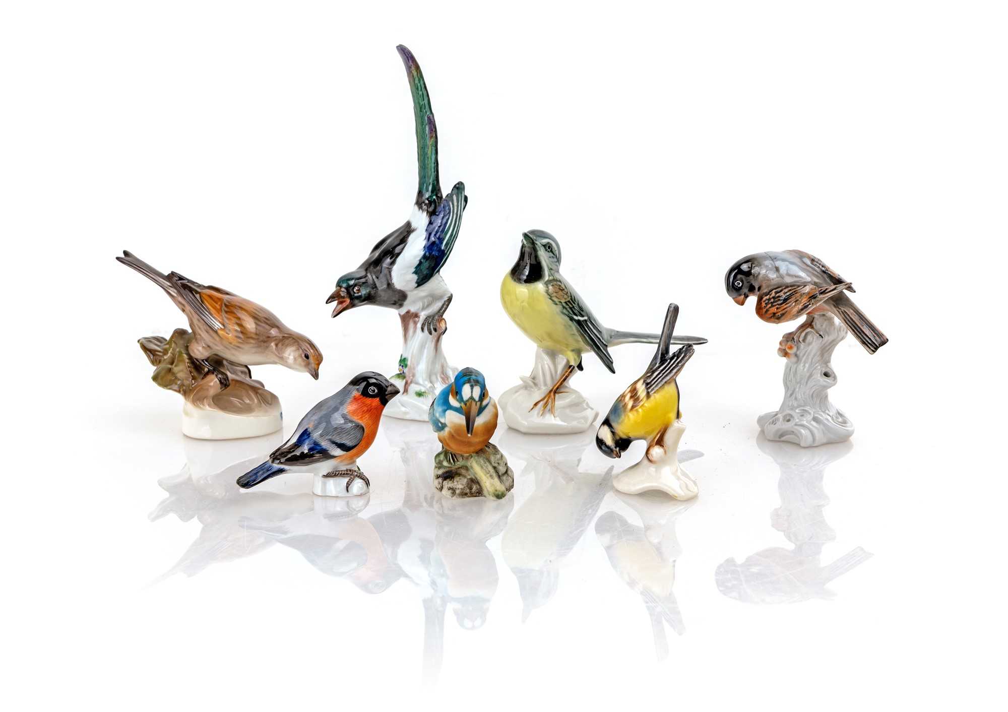 Sette figure di uccelli diversi in porcellana policroma, manifattura tedesca e francese Nymphenburg, Goebel, Meissen da cm 5 a cm 20