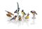Sette figure di uccelli diversi in porcellana policroma, manifattura tedesca e francese