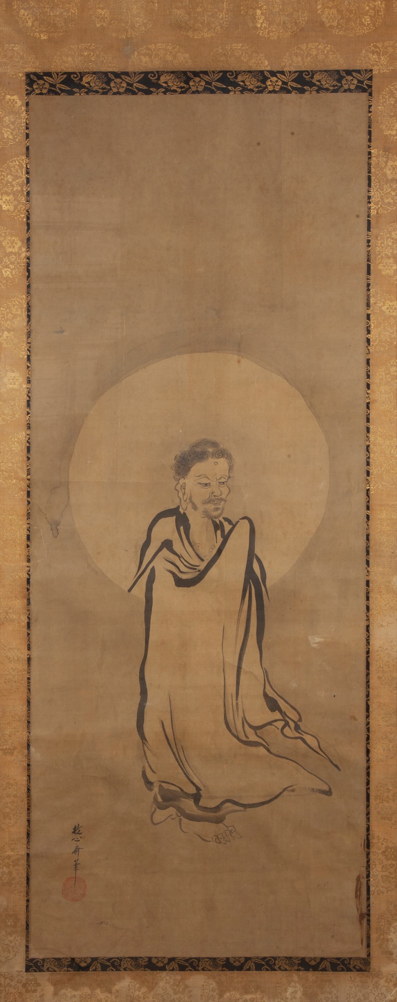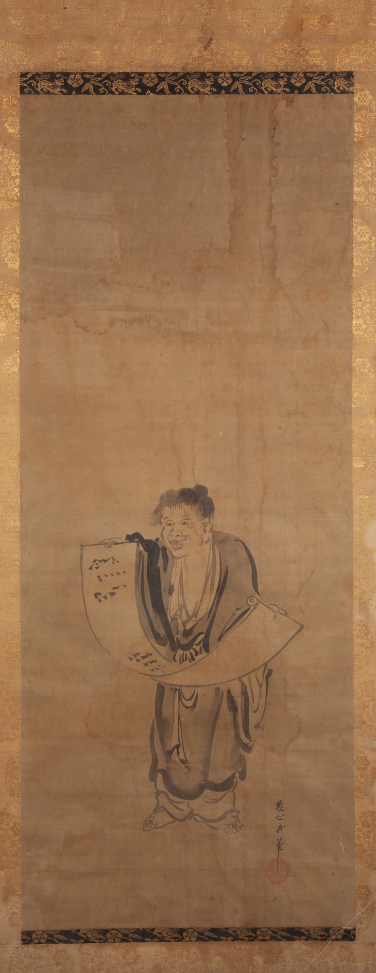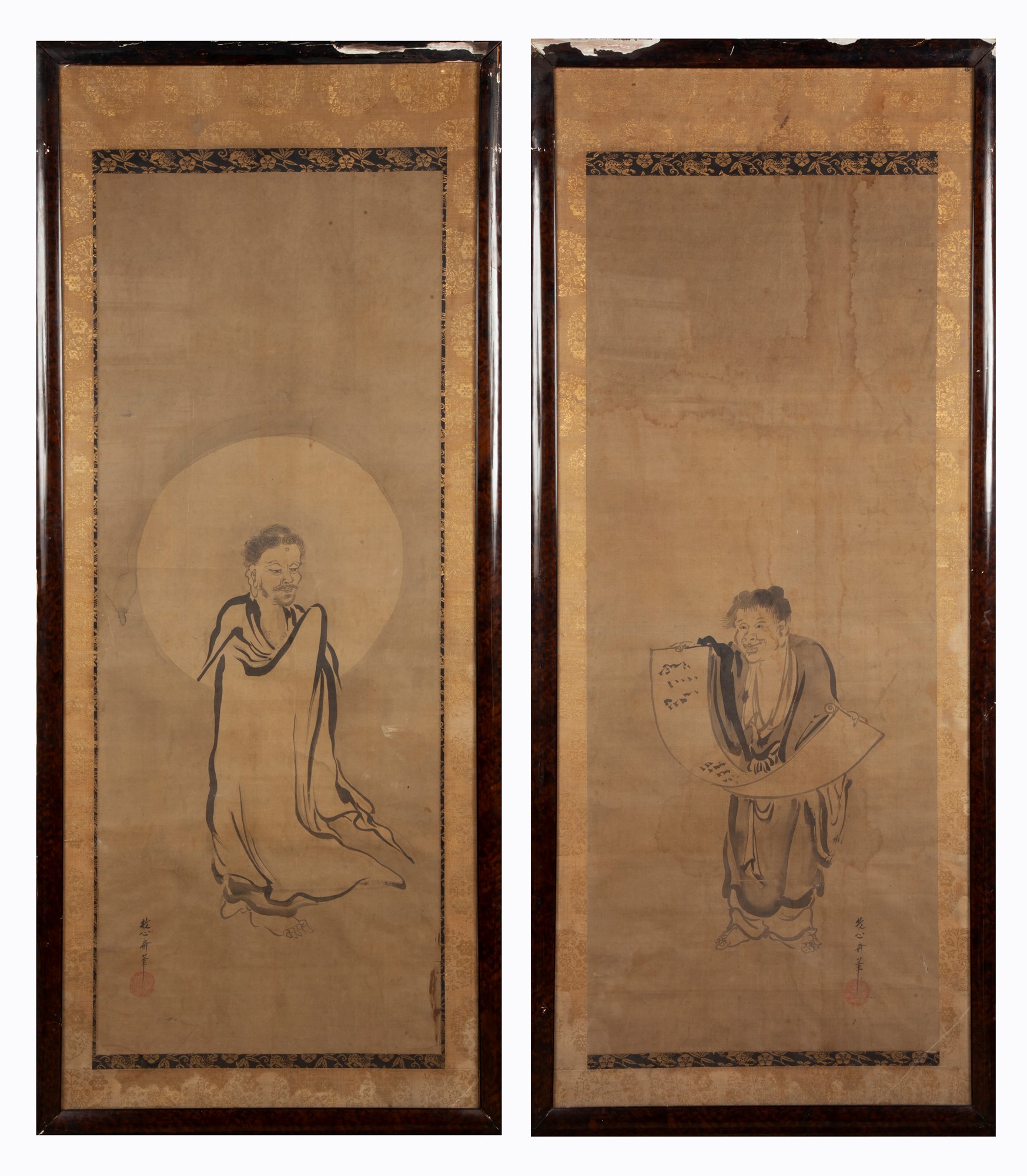 Coppia di antichi pannelli giapponesi, scuola di Nakahashi Kano, primo periodo Edo attribuibili al pittore Yasunobu Kano, noto come Bokushinsai (1613 - 1685) raffiguranti monaci, entro cornici laccate inchiostro e acquerello monocromo su seta cm 110x44 - in cornice cm 138x60