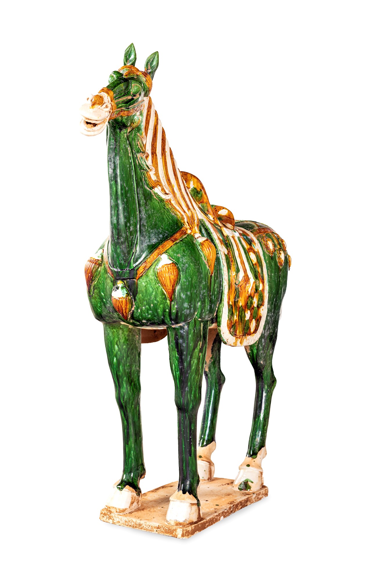 Grande cavallo bardato in terracotta invetriata a tre colori, Cina, fine dinastia Qing