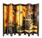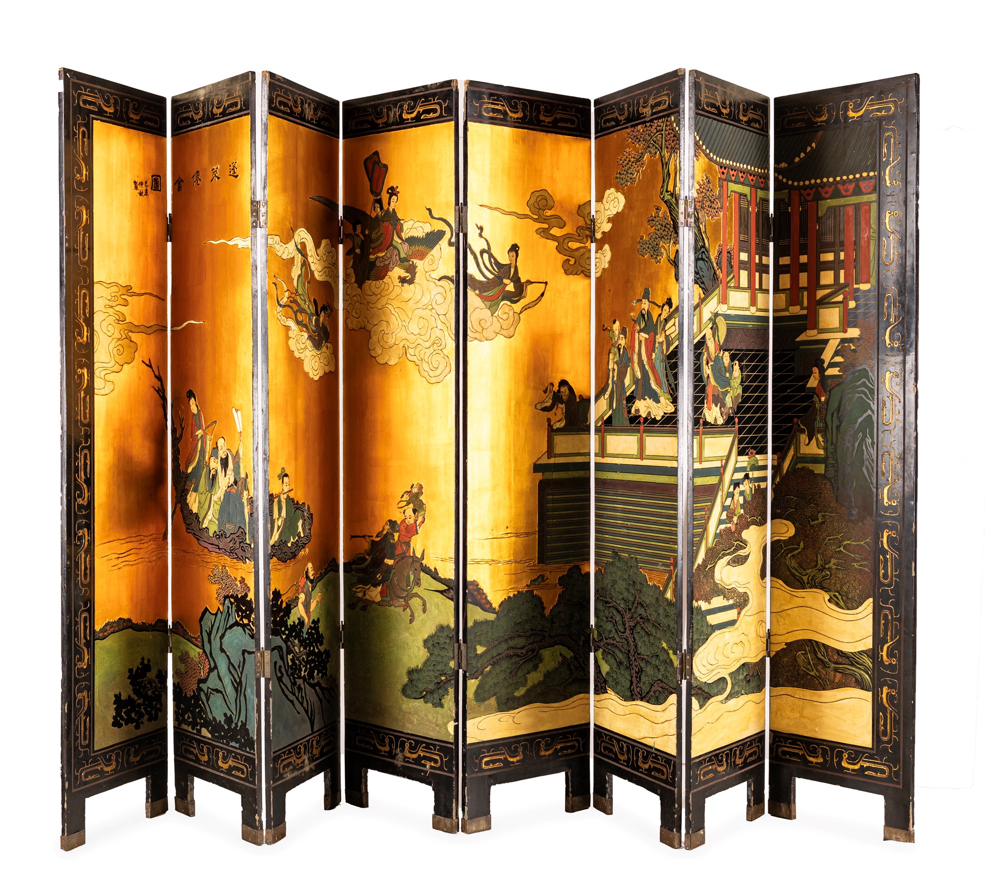 Paravento a otto ante in legno laccato, Giappone, inizi del XX secolo con decorazione graffita e dipinta in policromia; al recto un paesaggio con architetture su fondo oro ed al verso tralci di fiori e figure di volatile cm 184x40,5 ogni anta