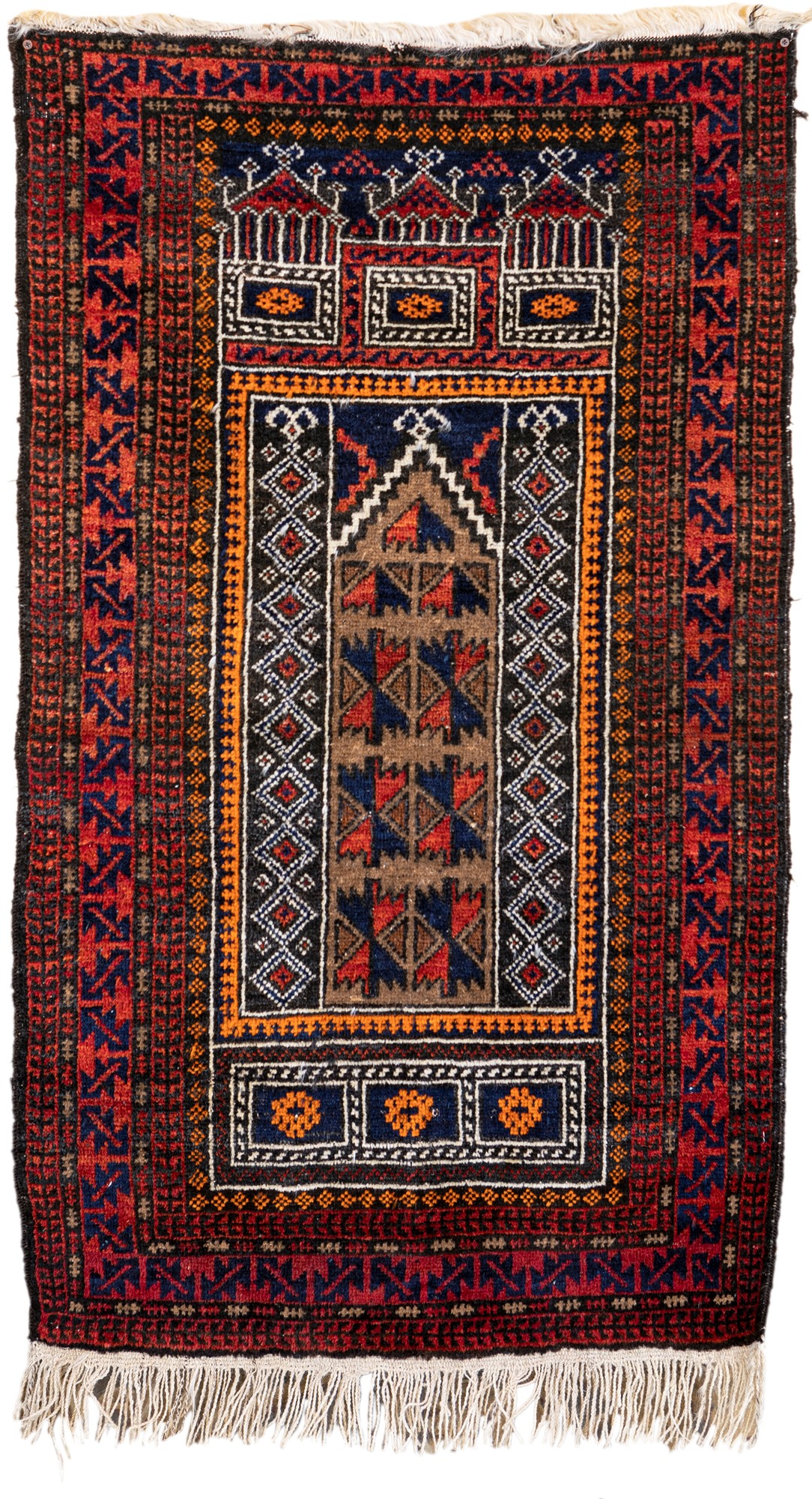 Preghiera persiana Baluci con disegno a motivi geometrici in arancio e bruno; cornici principale fondo rosso cm 135x80