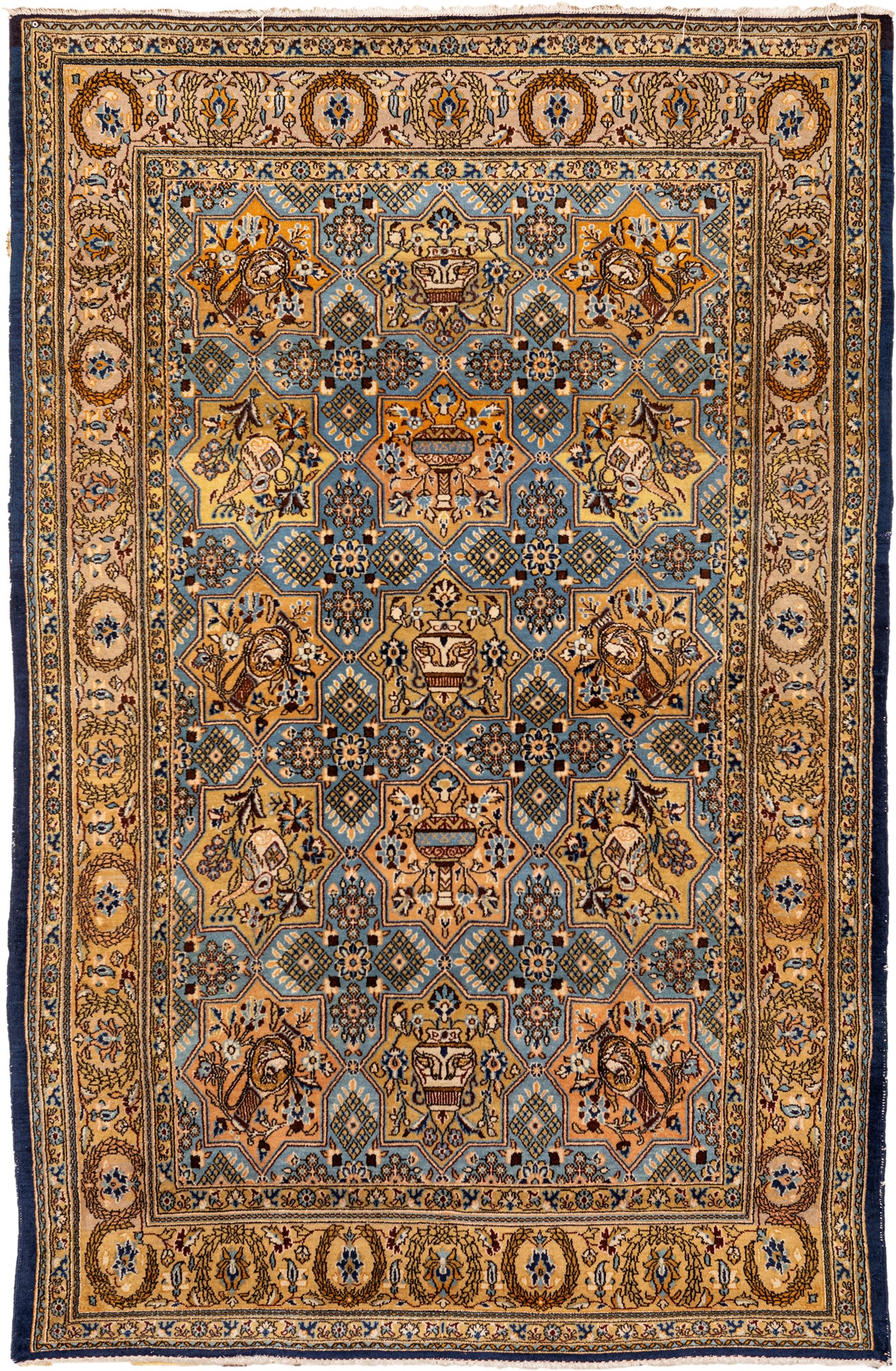 Tappeto celeste e beige a disegno naturalistico e geometrico