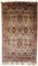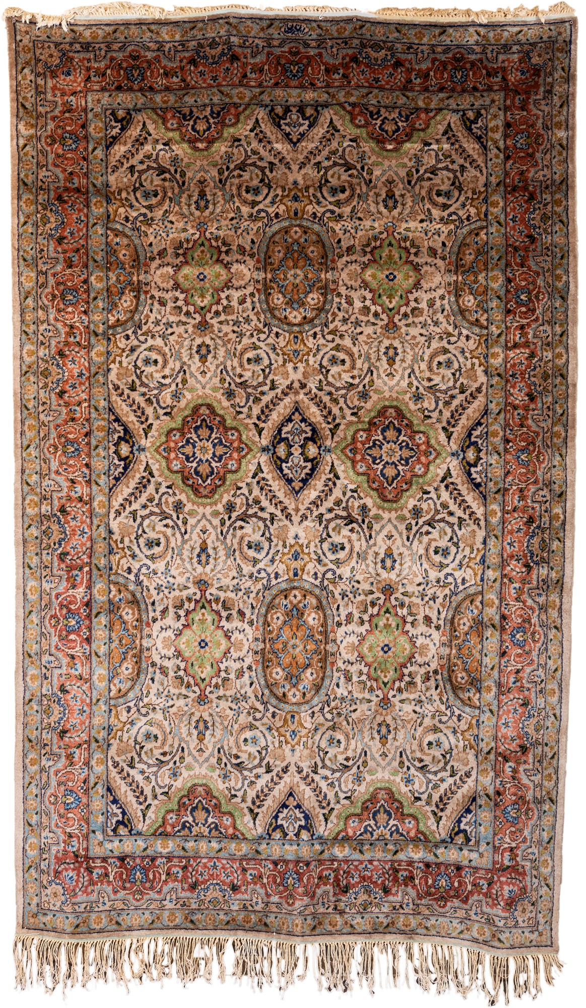 Tappeto persiano Kirman con medaglioni sparsi su fondo chiaro, circondati da sottili volute fiorite; cornice principale fondo rosa cm 297x183