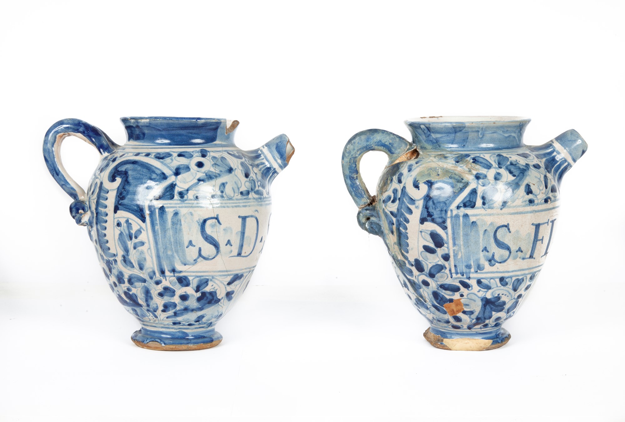 Coppia di brocche in maiolica bianca e blu, XVIII secolo