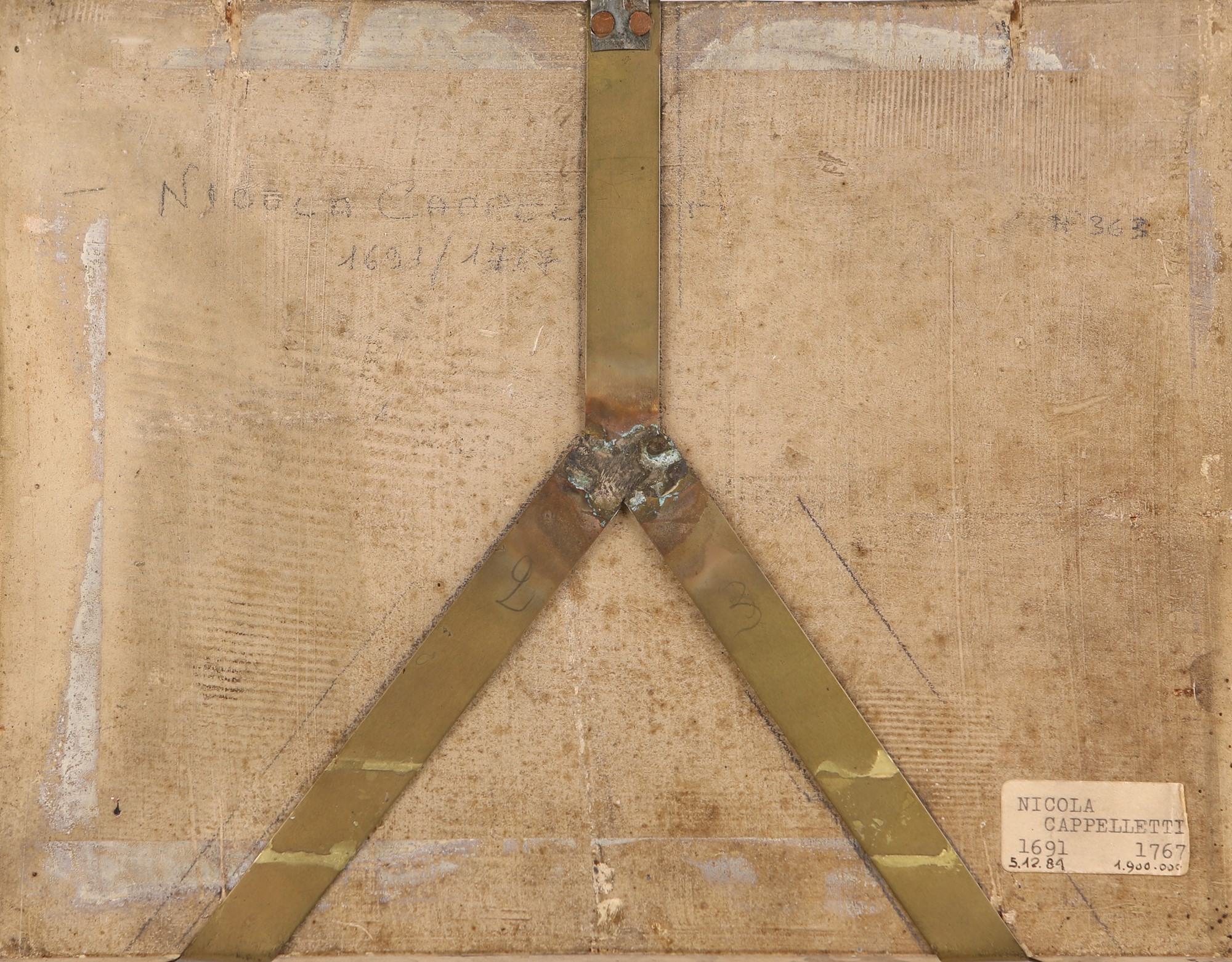 Mattonella in maiolica policroma, Castelli, seconda metà del XVIII secolo raffigurante un paesaggio con figure, resti di un tempio antico a sinistra, alberi a destra; sullo sfondo un veliero ed una città turrita. Al verso etichetta di antica collezione con riferimento a Nicola Cappelletti cm 20x26