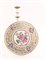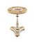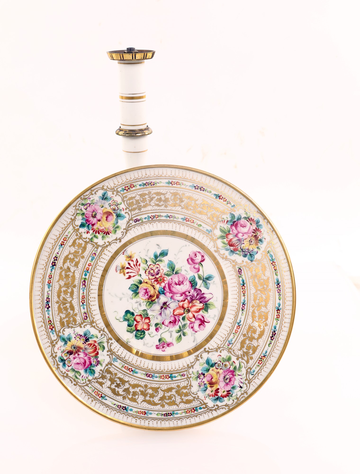 Tavolino basso in porcellana bianca con profili dorati piano circolare su balaustro e base trilobata, decorato in vivace policromia da fitta composizione floreale cm 52x38,5